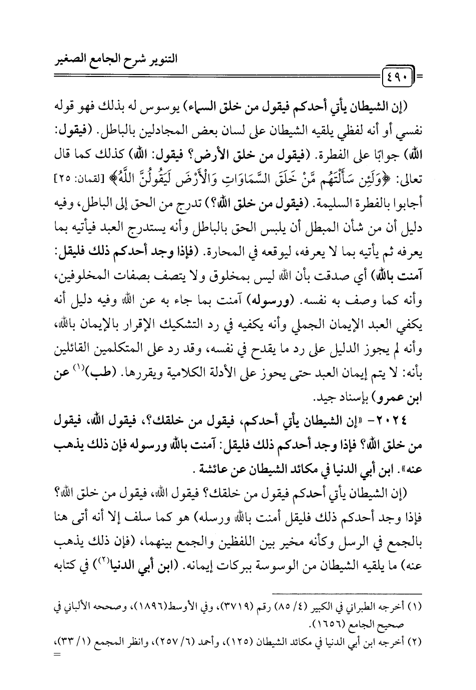 (إن الشيطان يأتي أحدكم فيقول من خلق السماء) يوسوس له بذلك فهو قوله نفسي أو أنه لفظي يلقيه الشيطان على لسان بعض المجادلين بالباطل. (فيقول: الله) جوابًا على الفطرة. (فيقول من خلق الأرض؟ فيقول: الله) كذلك كما قال تعالى: {وَلَئِنْ سَأَلْتَهُمْ مَنْ خَلَقَ السَّمَاوَاتِ وَالْأَرْضَ لَيَقُولُنَّ اللَّهُ} [لقمان: 25] أجابوا بالفطرة السليمة. (فيقول من خلق الله؟) تدرج من الحق إلى الباطل، وفيه دليل أن من شأن المبطل أن يلبس الحق بالباطل وأنه يستدرج العبد فيأتيه بما يعرفه ثم يأتيه بما لا يعرفه، ليوقعه في المحارة. (فإذا وجد أحدكم ذلك فليقل: آمنت بالله) أي صدقت بأن الله ليس بمخلوق ولا يتصف بصفات المخلوفين، وأنه كما وصف به نفسه. (ورسوله) آمنت بما جاء به عن الله وفيه دليل أنه يكفي العبد الإيمان الجملي وأنه يكفيه في رد التشكيك الإقرار بالإيمان بالله، وأنه لم يجوز الدليل على رد ما يقدح في نفسه، وقد رد على المتكلمين القائلين بأنه: لا يتم إيمان العبد حتى يحوز على الأدلة الكلامية ويقررها. (طب) (¬1) عن ابن عمرو) بإسناد جيد.