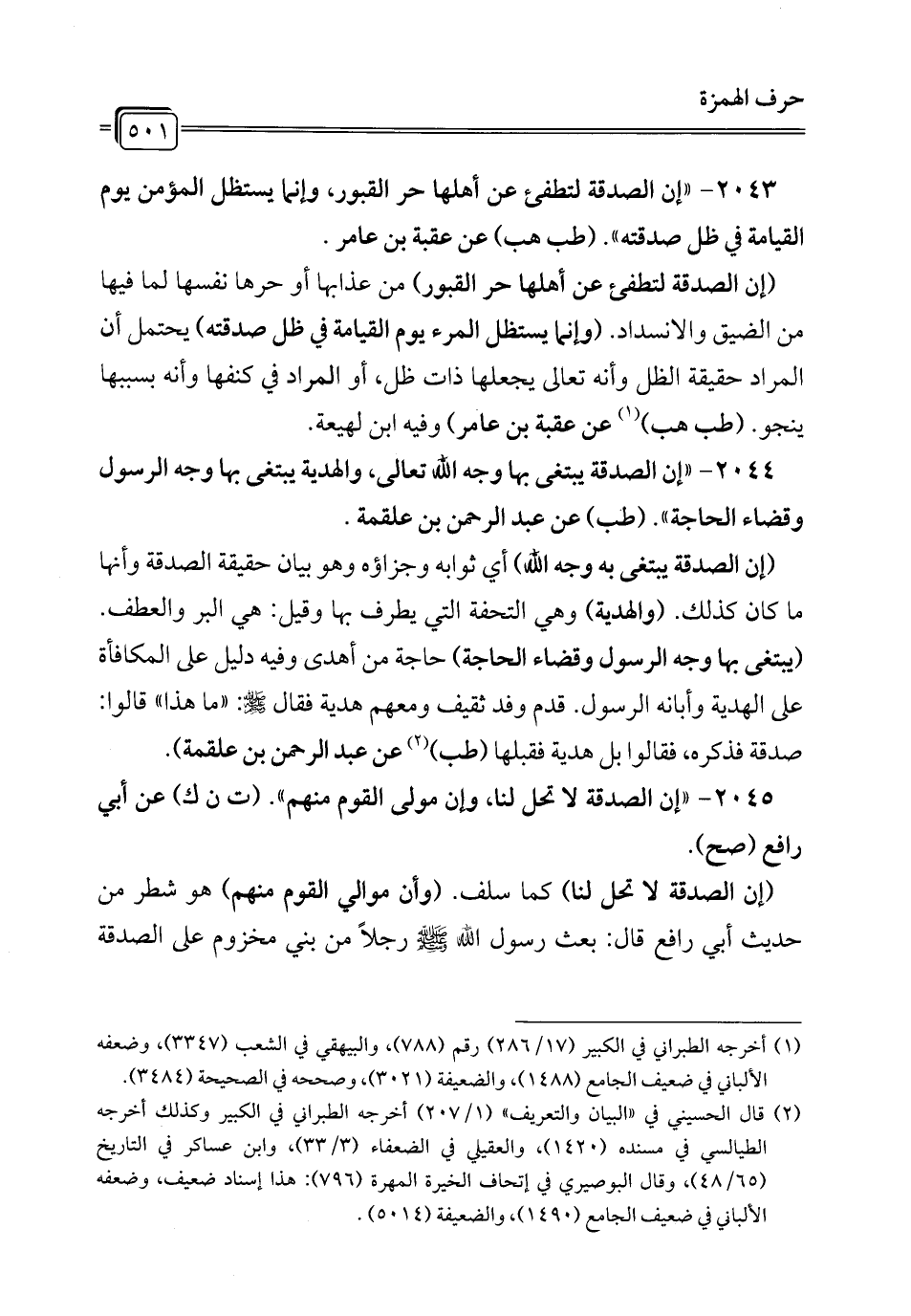 2043 - "إن الصدقة لتطفئ عن أهلها حر القبور، وإنما يستظل المؤمن يوم القيامة في ظل صدقته". (طب هب) عن عقبة بن عامر.