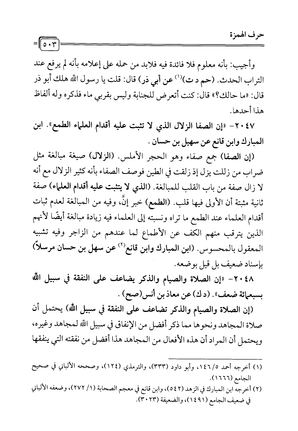 2047 - "إن الصفا الزلال الذي لا تثبت عليه أقدام العلماء الطمع". ابن المبارك وابن قانع عن سهيل بن حسان.