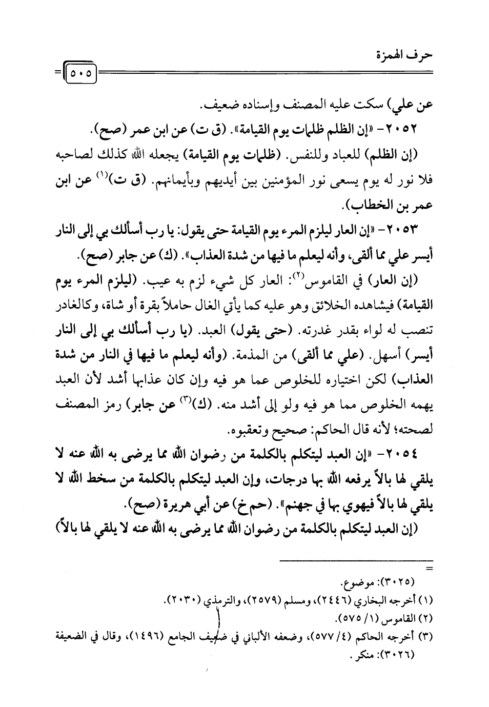 2053 - "إن العار ليلزم المرء يوم القيامة حتى يقول: يا ربِّ أسألك بي إلى النار أيسر علي مما ألقى، وأنه ليعلم ما فيها من شدة العذاب". (ك) عن جابر (صح).