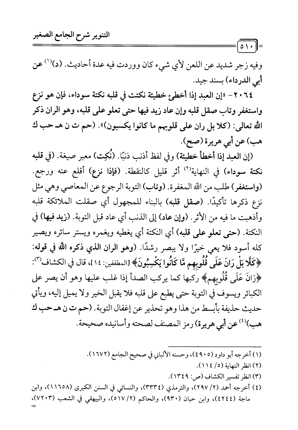 2064 - "إن العبد إذا أخطئ خطيئة نكتت في قلبه نكتة سوداء، فإن هو نزع واستغفر وتاب صقل قلبه وإن عاد زيد فيها حتى تعلو على قلبه، وهو الران ذكر الله تعالى: {كَلَّا بَلْ رَانَ عَلَى قُلُوبِهِمْ مَا كَانُوا يَكْسِبُونَ} ". (حم ت ن هـ حب ك هب) عن أبي هريرة (صح).