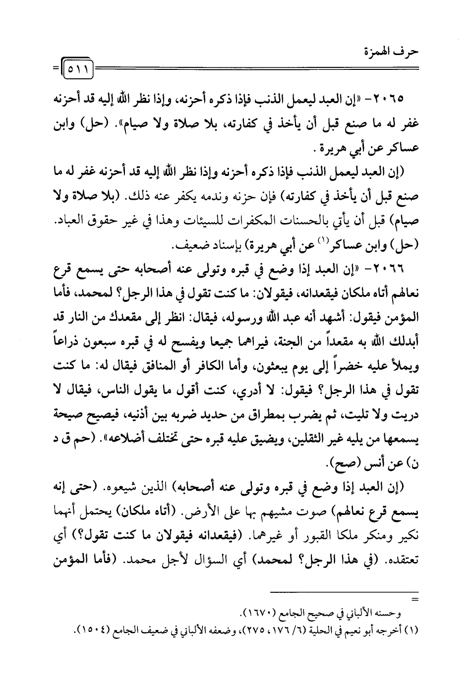 2066 - "إن العبد إذا وضع في قبره وتولى عنه أصحابه حتى يسمع قرع نعالهم أتاه ملكان فيقعدانه، فيقولان: ما كنت تقول في هذا الرجل؟ لمحمد، فأما المؤمن فيقول: أشهد أنه عبد الله ورسوله، فيقال: انظر إلى مقعدك من النار قد أبدلك الله به مقعدًا من الجنّة، فيراهما جميعًا ويفسح له في قبره سبعون ذراعًا ويملأ عليه خضرًا إلى يوم يبعثون، وأما الكافر أو المنافق فيقال له: ما كنت تقول في هذا الرجل؟ فيقول: لا أدري، كنت أقول ما يقول الناس، فيقال لا دريت ولا تليت، ثم يضرب بمطراق من حديد ضربه بين أذنيه، فيصيح صيحة يمسمعها من يليه غير الثقلين، ويضيق عليه قبره حتى تختلف أضلاعه". (حم ق د ن) عن أنس (صح).