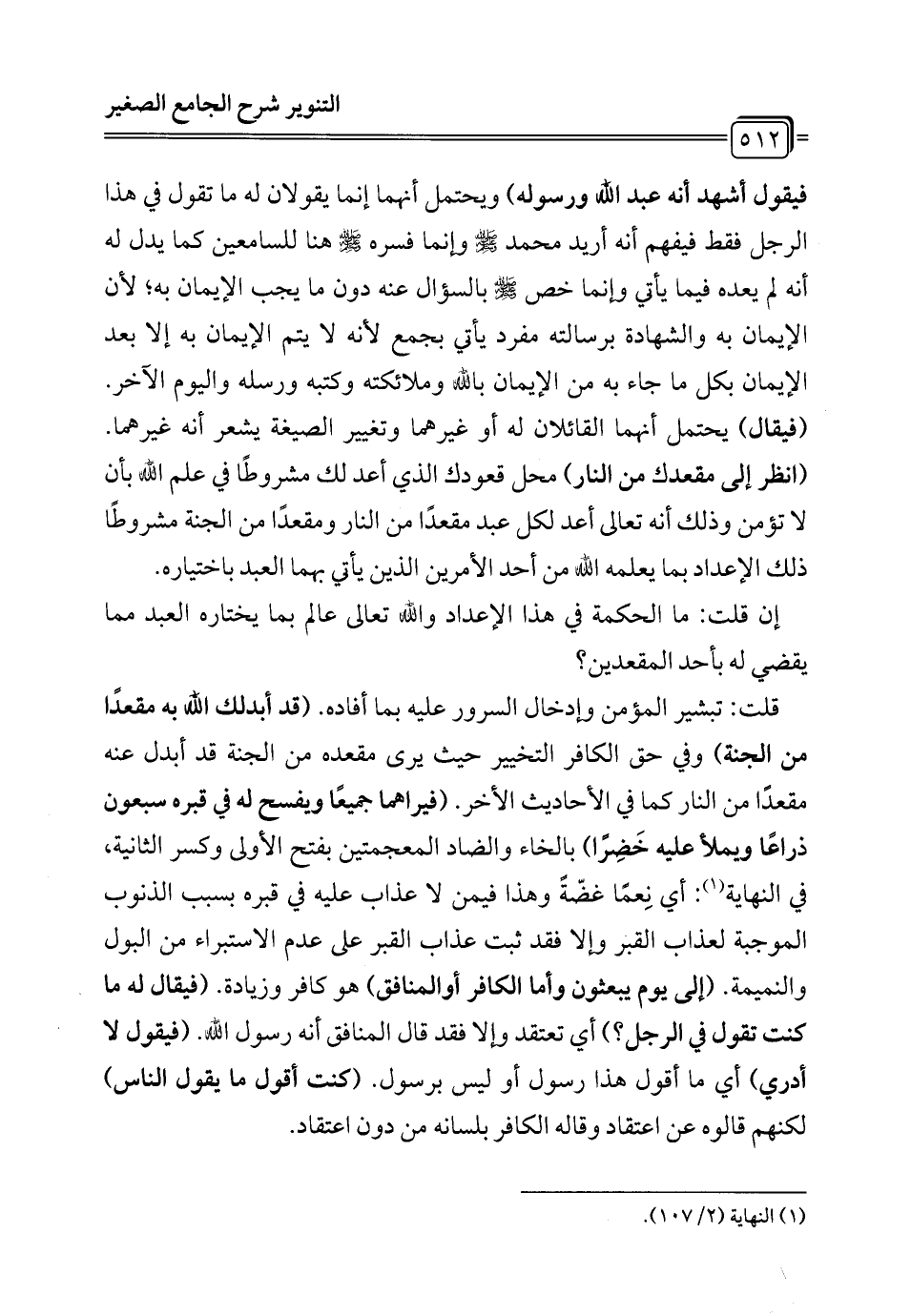 فيقول أشهد أنه عبد الله ورسوله) ويحتمل أنهما إنّما يقولان له ما تقول في هذا الرجل فقط فيفهم أنه أريد محمَّد - صلى الله عليه وسلم - وإنّما فسره - صلى الله عليه وسلم - هنا للسامعين كما يدل له أنه لم يعده فيما يأتي وإنما خص - صلى الله عليه وسلم - بالسؤال عنه دون ما يجب الإيمان به؛ لأن الإيمان به والشهادة برسالته مفرد يأتي بجمع لأنّه لا يتم الإيمان به إلا بعد الإيمان بكل ما جاء به من الإيمان بالله وملائكته وكتبه ورسله واليوم الآخر. (فيقال) يحتمل أنهما القائلان له أو غيرهما وتغيير الصيغة يشعر أنه غيرهما. (انظر إلى مقعدك من النار) محل قعودك الذي أعد لك مشروطًا في علم الله بأن لا تؤمن وذلك أنه تعالى أعد لكل عبد مقعدًا من النار ومقعدًا من الجنّة مشروطًا ذلك الإعداد بما يعلمه الله من أحد الأمرين الذين يأتي بهما العبد باختياره.