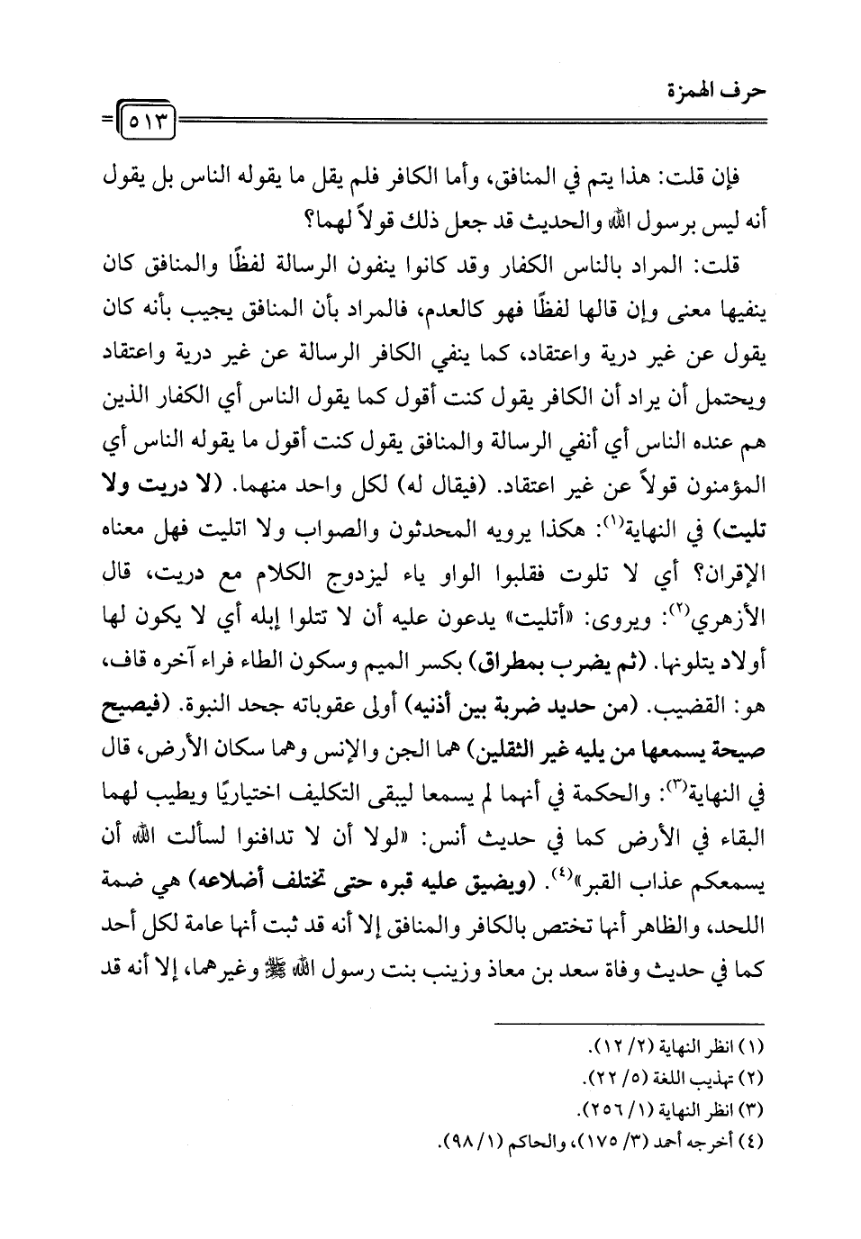 قلت: المراد بالناس الكفار وقد كانوا ينفون الرسالة لفظًا والمنافق كان ينفيها معنى وإن قالها لفظًا فهو كالعدم، فالمراد بأن المنافق يجيب بأنه كان يقول عن غير درية واعتقاد، كما ينفي الكافر الرسالة عن غير درية واعتقاد ويحتمل أن يراد أن الكافر يقول كنت أقول كما يقول الناس أي الكفار الذين هم عنده الناس أي أنفي الرسالة والمنافق يقول كنت أقول ما يقوله الناس أي المؤمنون قولًا عن غير اعتقاد. (فيقال له) لكل واحد منهما. (لا دريت ولا تليت) في النهاية (¬1): هكذا يرويه المحدثون والصواب ولا اتليت فهل معناه الإقران؟ أي لا تلوت فقلبوا الواو ياء ليزدوج الكلام مع دريت، قال الأزهري (¬2): ويروى: "أتليت" يدعون عليه أن لا تتلوا إبله أي لا يكون لها أولاد يتلونها. (ثم يضرب بمطراق) بكسر الميم وسكون الطاء فراء آخره قاف، هو: القضيب. (من حديد ضربة بين أذنيه) أولى عقوباته جحد النبوة. (فيصيح صيحة يسمعها من يليه غير الثقلين) هما الجن والإنس وهما سكان الأرض، قال في النهاية (¬3): والحكمة في أنهما لم يسمعا ليبقى التكليف اختياريًا ويطيب لهما البقاء في الأرض كما في حديث أنس: "لولا أن لا تدافنوا لسألت الله أن يسمعكم عذاب القبر" (¬4). (ويضيق عليه قبره حتى تختلف أضلاعه) هي ضمة اللحد، والظاهر أنهما تختص بالكافر والمنافق إلا أنه قد ثبت أنها عامة لكل أحد كما في حديث وفاة سعد بن معاذ وزينب بنت رسول الله - صلى الله عليه وسلم - وغيرهما، إلا أنه قد