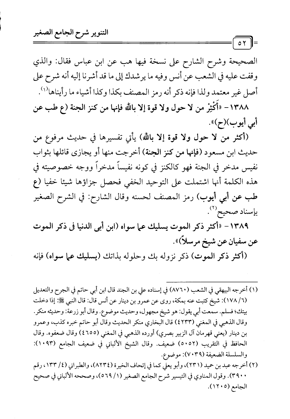 1388 - "أَكْثِرْ من لا حول ولا قوة إلا بالله فإنها من كنز الجنة (ع طب عن أبي أيوب) (ح) ".