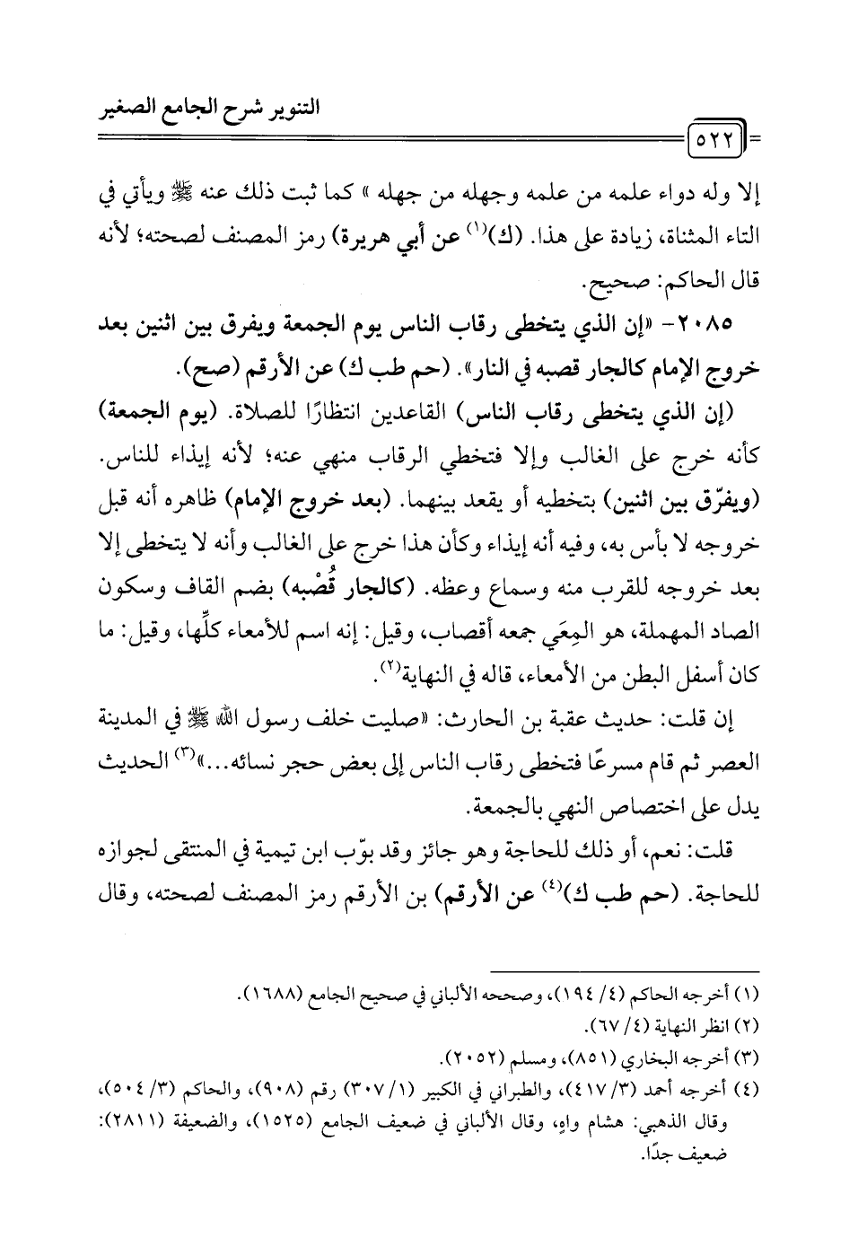 2085 - "إن الذي يتخطى رقاب الناس يوم الجمعة ويفرق بين اثنين بعد خروج الإِمام كالجار قصبه في النار". (حم طب ك) عن الأرقم (صح).