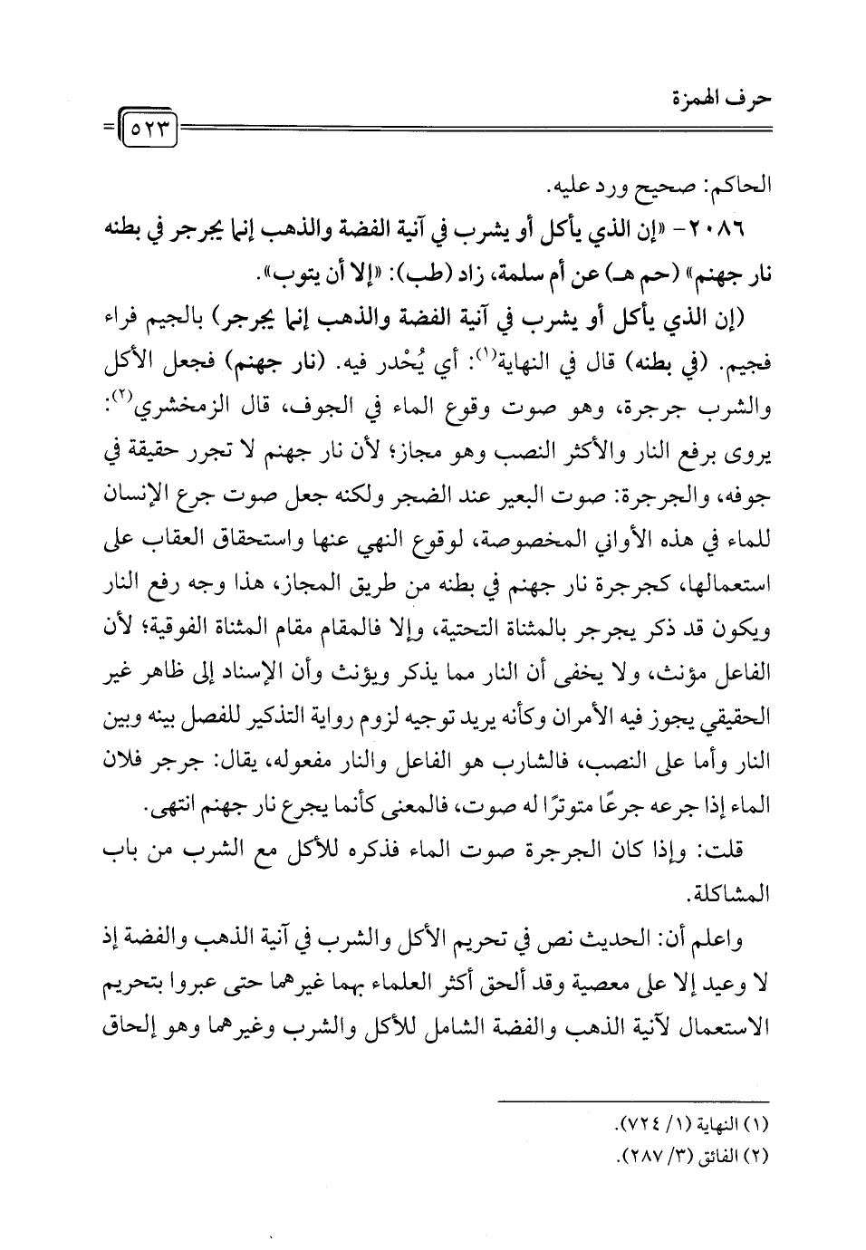 (إن الذي يأكل أو يشرب في آنية الفضة والذهب إنّما يجرجر) بالجيم فراء فجيم. (في بطنه) قال في النهاية (¬1): أي يُحْدر فيه. (نار جهنم) فجعل الأكل والشرب جرجرة، وهو صوت وقوع الماء في الجوف، قال الزمخشري (¬2): يروى برفع النار والأكثر النصب وهو مجاز؛ لأن نار جهنم لا تجرر حقيقة في جوفه، والجرجرة: صوت البعير عند الضمير ولكنه جعل صوت جرع الإنسان للماء في هذه الأواني المخصوصة، لوقوع النهي عنها واستحقاق العقاب على استعمالها، كجرجرة نار جهنم في بطنه من طريق المجاز، هذا وجه رفع النار ويكون قد ذكر يجرجر بالمثناة التحتية، وإلا فالمقام مقام المثناة الفوقية؛ لأن الفاعل مؤنث، ولا يخفى أن النار مما يذكر ويؤنث وأن الإسناد إلى ظاهر غير الحقيقي يجوز فيه الأمران وكأنه يريد توجيه لزوم رواية التذكير للفصل بينه وبين النار وأما على النصب، فالشارب هو الفاعل والنار مفعوله، يقال: جرجر فلان الماء إذا جرعه جرعًا متوترًا له صوت، فالمعنى كأنما يجرع نار جهنم انتهى.