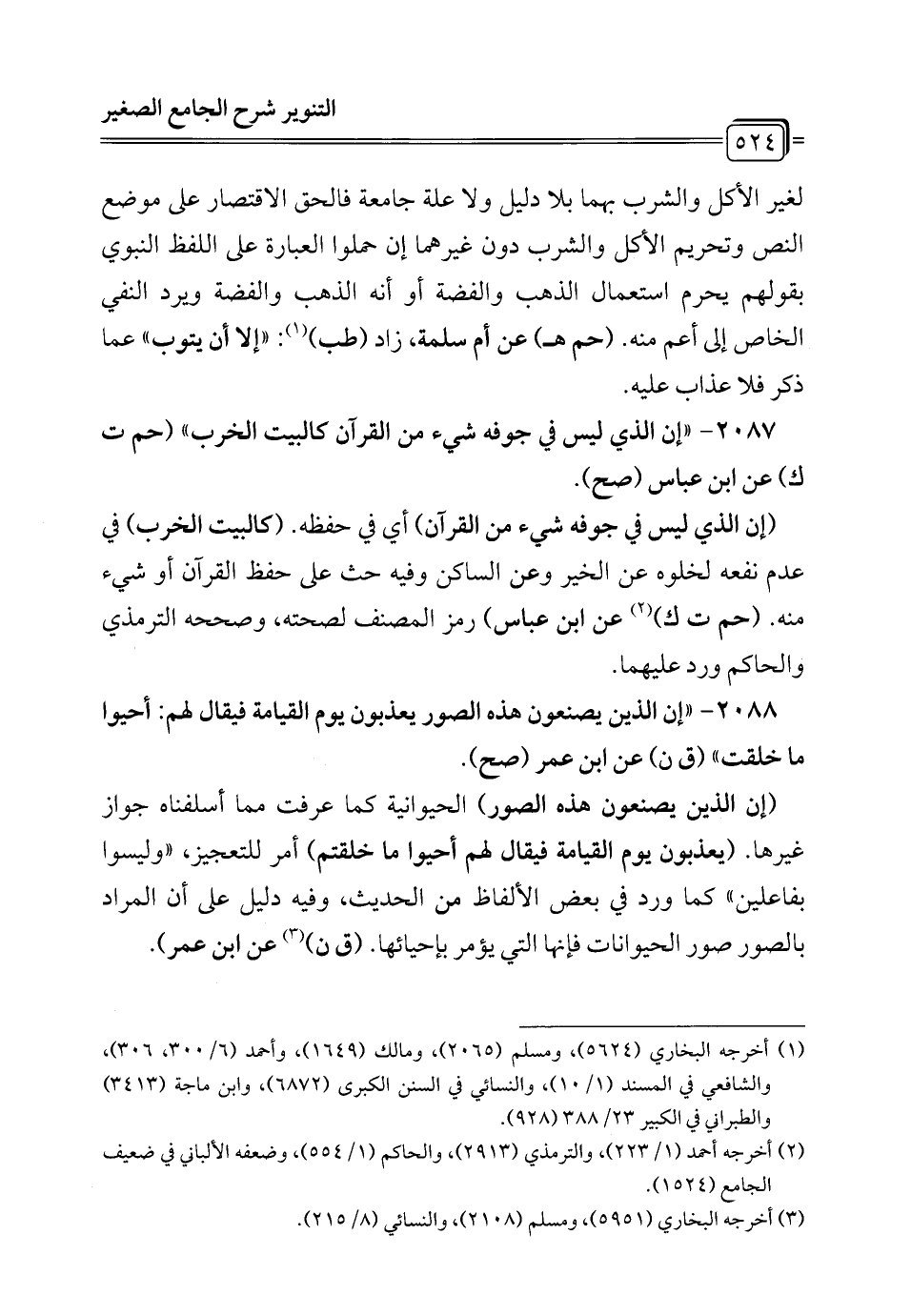 2088 - "إن الذين يصنعون هذه الصور يعذبون يوم القيامة فيقال لهم: أحيوا ما خلقت" (ق ن) عن ابن عمر (صح).