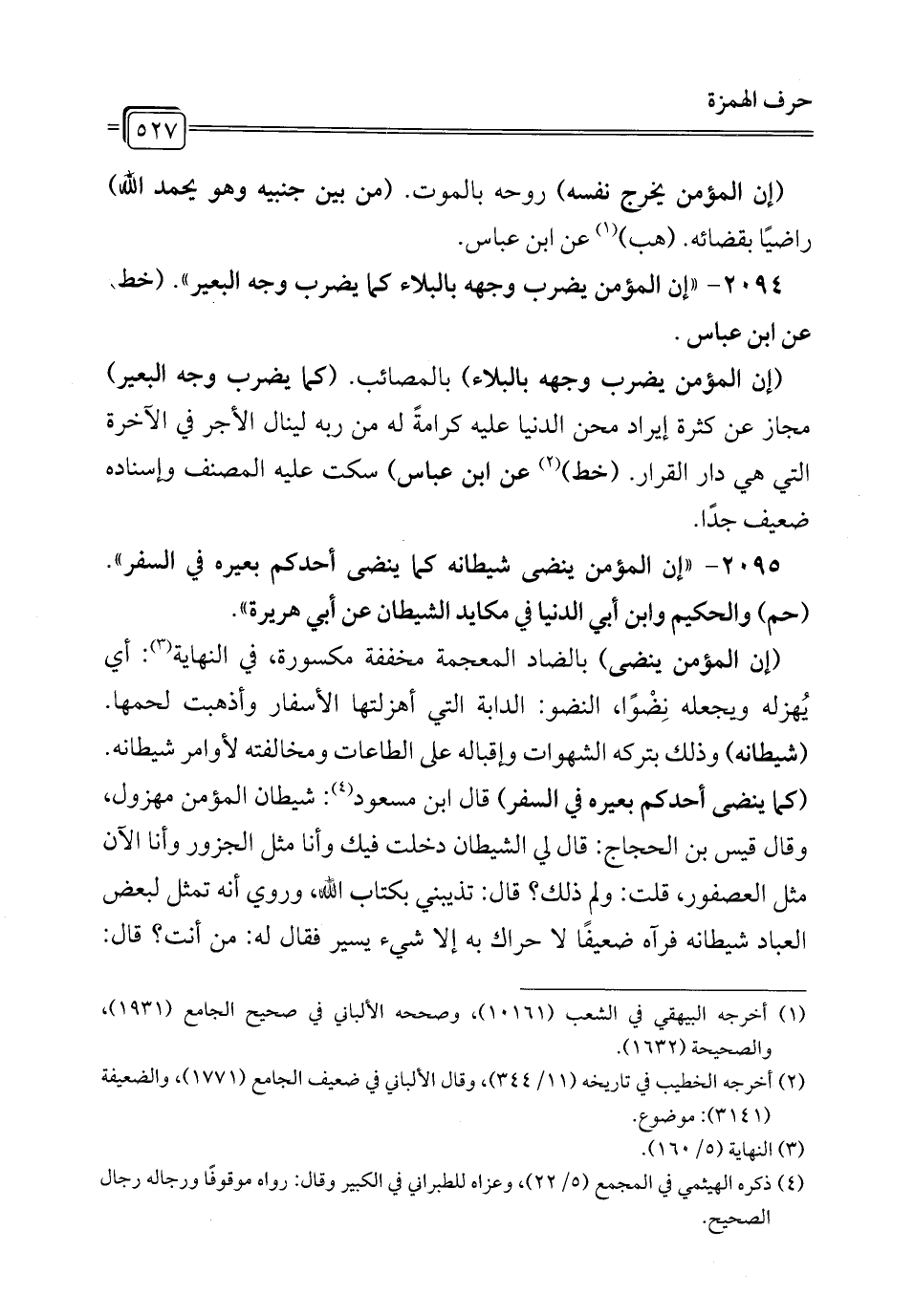 2095 - "إن المؤمن ينضى شيطانه كما ينضى أحدكم بعيره في السفر". (حم) والحكيم وابن أبي الدنيا في مكايد الشيطان عن أبي هريرة".