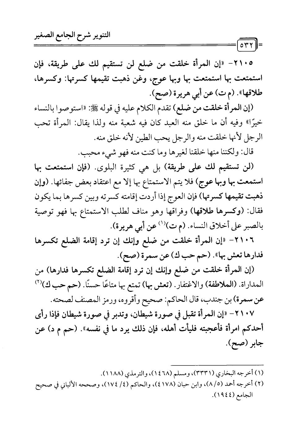2105 - "إن المرأة خلقت من ضلع لن تستقيم لك على طريقة فإن استمتعت بها استمتعت بها وبها عوج، وإن ذهبت تقيمها كسرتها: وكسرها، طلاقها". (م ت) عن أبي هريرة (صح).