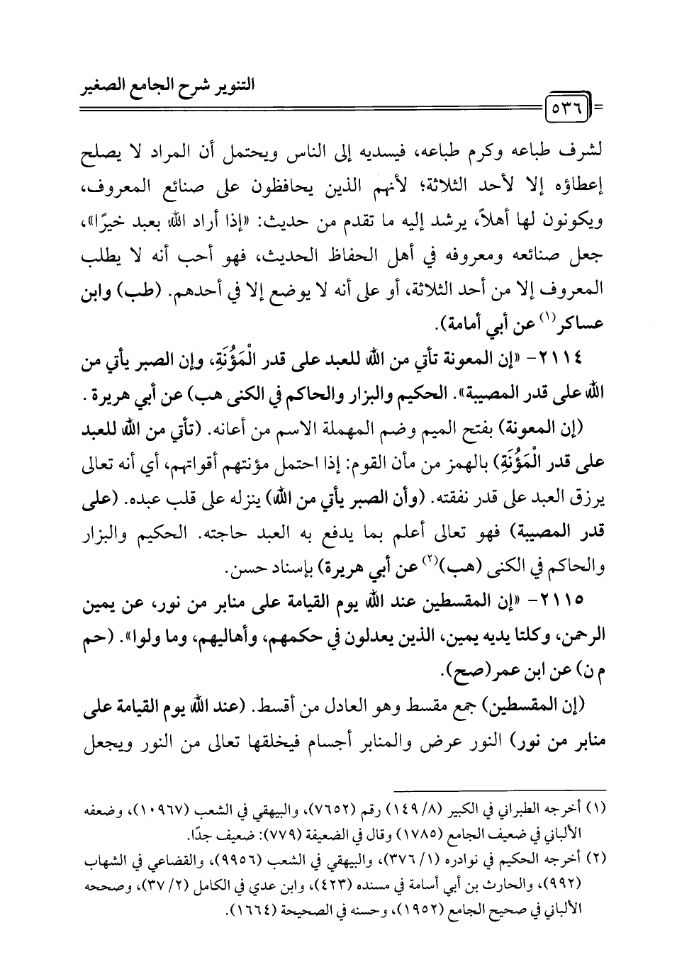 2114 - "إن المعونة تأتي من الله للعبد على قدر الْمَؤُنَةِ وإن الصبر يأتي من الله على قدر المصيبة". الحكيم والبزار والحاكم في الكنى هب) عن أبي هريرة.