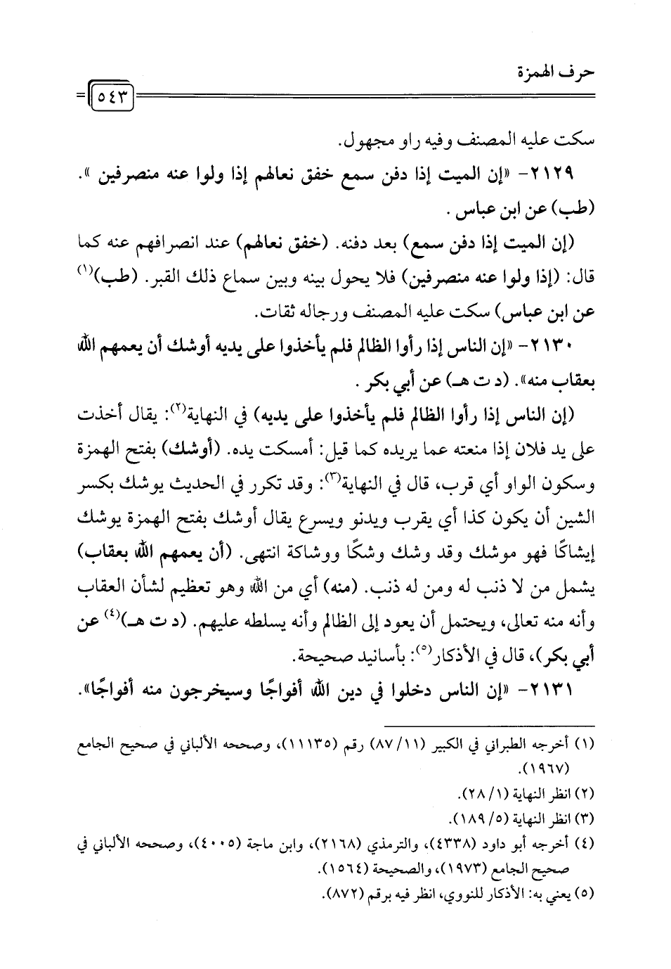 2130 - "إن الناس إذا رأوا الظالم فلم يأخذوا على يديه أوشك أن يعمهم الله بعقاب منه". (د ت هـ) عن أبي بكر.