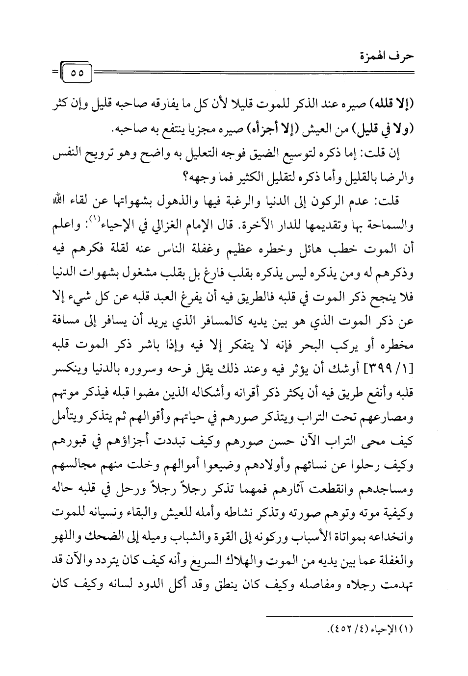 قلت: عدم الركون إلى الدنيا والرغبة فيها والذهول بشهواتها عن لقاء الله والسماحة بها وتقديمها للدار الآخرة. قال الإِمام الغزالي في الإحياء (¬1): واعلم أن الموت خطب هائل وخطره عظيم وغفلة الناس عنه لقلة فكرهم فيه وذكرهم له ومن يذكره ليس يذكره بقلب فارغ بل بقلب مشغول بشهوات الدنيا فلا ينجح ذكر الموت في قلبه فالطريق فيه أن يفرغ العبد قلبه عن كل شيء إلا عن ذكر الموت الذي هو بين يديه كالمسافر الذي يريد أن يسافر إلى مسافة مخطره أو يركب البحر فإنه لا يتفكر إلا فيه وإذا باشر ذكر الموت قلبه [1/ 399] أوشك أن يؤثر فيه وعند ذلك يقل فرحه وسروره بالدنيا وينكسر قلبه وأنفع طريق فيه أن يكثر ذكر أقرانه وأشكاله الذين مضوا قبله فيذكر موتهم ومصارعهم تحت التراب ويتذكر صورهم في حياتهم وأقوالهم ثم يتذكر ويتأمل كيف محى التراب الآن حسن صورهم وكيف تبددت أجزاؤهم في قبورهم وكيف رحلوا عن نسائهم وأولادهم وضيعوا أموالهم وخلت منهم مجالسهم ومساجدهم وانقطعت آثارهم فمهما تذكر رجلًا رجلًا ورحل في قلبه حاله وكيفية موته وتوهم صورته وتذكر نشاطه وأمله للعيش والبقاء ونسيانه للموت وانخداعه بمواتاة الأسباب وركونه إلى القوة والشباب وميله إلى الضحك واللهو والغفلة عما بين يديه من الموت والهلاك السريع وأنه كيف كان يتردد والآن قد تهدمت رجلاه ومفاصله وكيف كان ينطق وقد أكل الدود لسانه وكيف كان