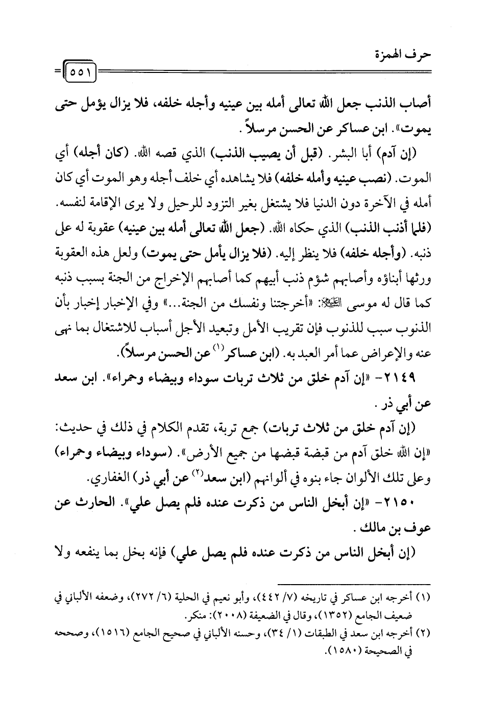 2149 - "إن آدم خلق من ثلاث تربات سوداء وبيضاء وحمراء". ابن سعد عن أبي ذر.