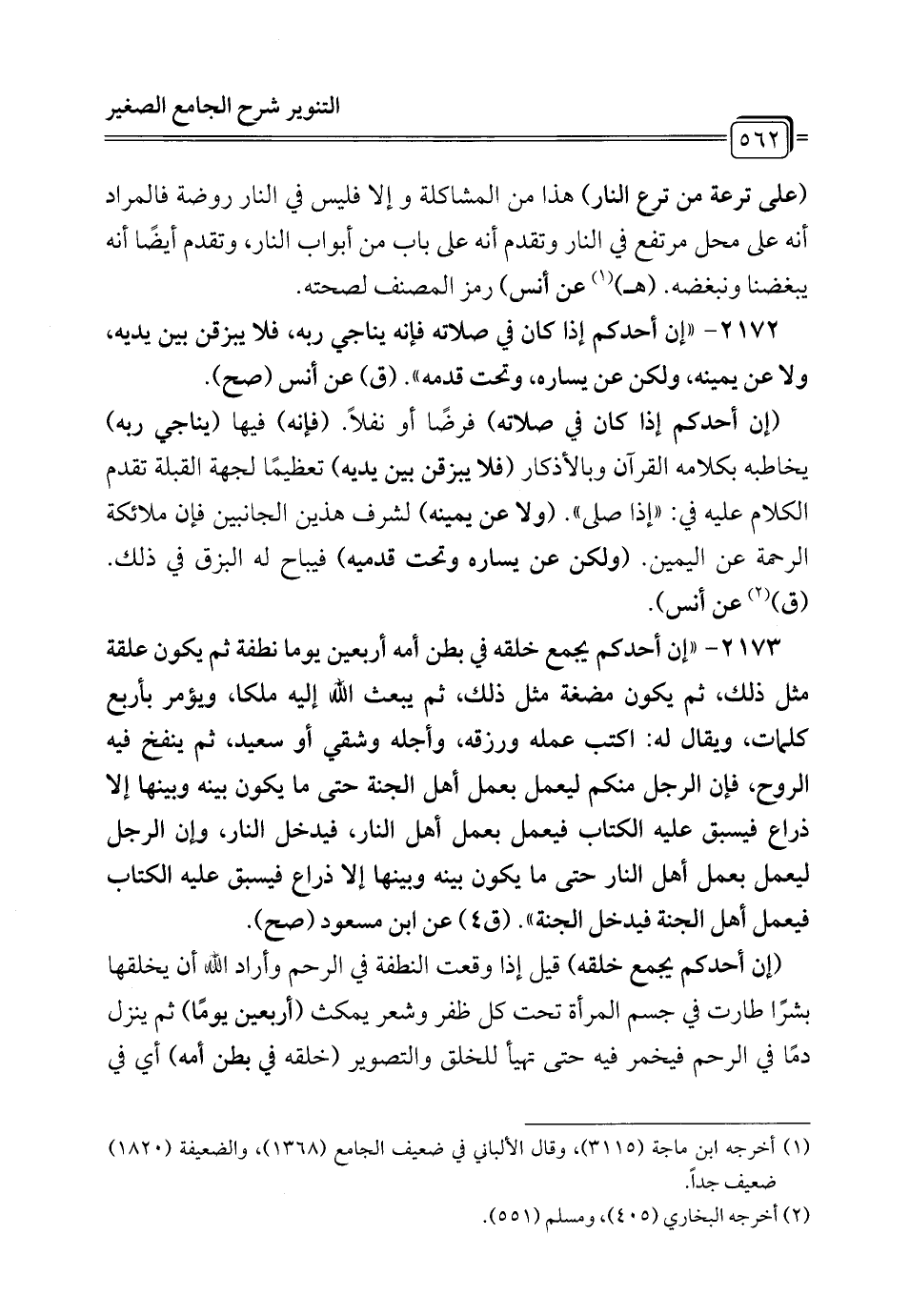 2173 - "إن أحدكم يجمع خلقه في بطن أمه أربعين يوما نطفة ثم يكون علقة مثل ذلك، ثم يكون مضغة مثل ذلك، ثم يبعث الله إليه ملكًا، ويؤمر بأربع كلمات، ويقال له: اكتب عمله ورزقه، وأجله وشقي أو سعيد، ثم ينفخ فيه الروح، فإن الرجل منكم ليعمل بعمل أهل الجنّة حتى ما يكون بينه وبينها إلا ذراع فيسبق عليه الكتاب فيعمل بعمل أهل النار، فيدخل النار، وإن الرجل ليعمل بعمل أهل النار حتى ما يكون بينه وبينها إلا ذراع فيسبق عليه الكتاب فيعمل أهل الجنّة فيدخل الجنة". (ق 4) عن ابن مسعود (صح).