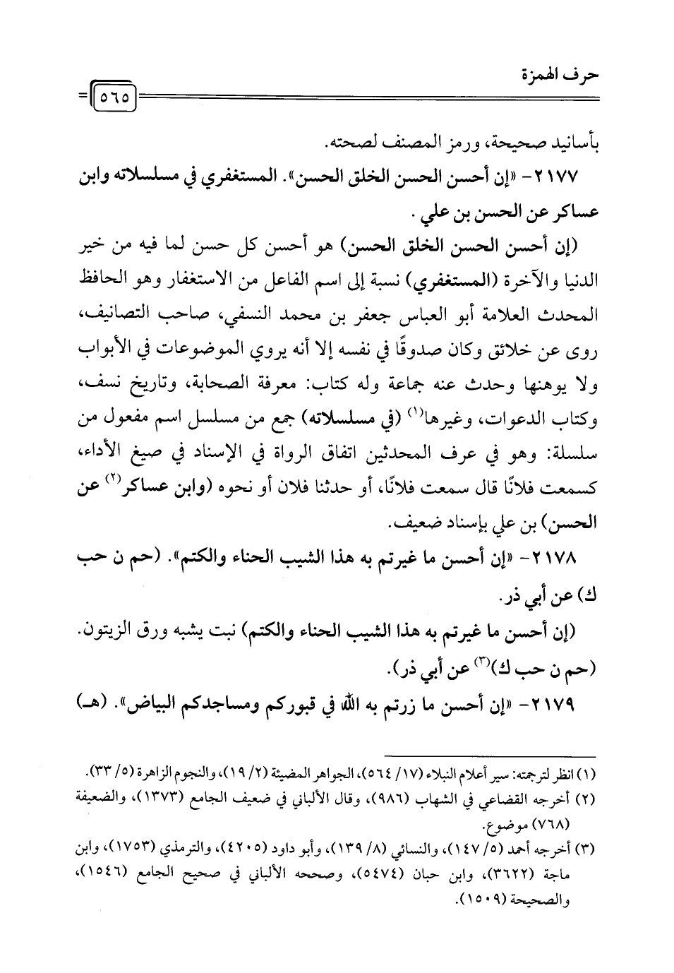 2177 - "إن أحسن الحسن الخلق الحسن". المستغفري في مسلسلاته وابن عساكر عن الحسن بن علي.