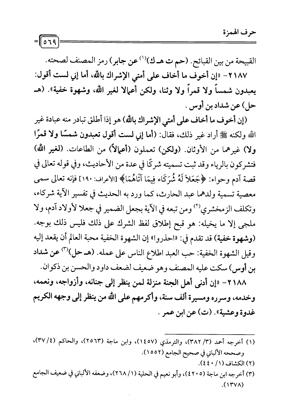 2187 - "إن أخوف ما أخاف على أمتي الإشراك الله، أما إني لست أقول: يعبدون شمسًا ولا قمرًا ولا وثنًا، ولكن أعمالا لغير الله، وشهوة خفية". (هـ حل) عن شداد بن أوس.