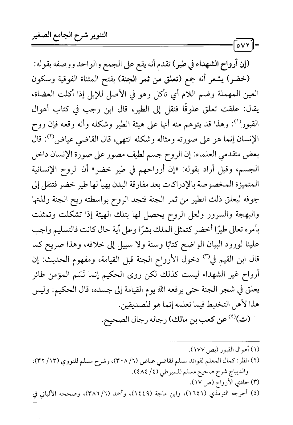 (خضر) يشعر أنه جمع (تعلق من ثمر الجنّة) بفتح المثناة الفوقية وسكون العين المهملة وضم اللام أي تأكل وهو في الأصل للإبل إذا أكلت العضاة، يقال: علقت تعلق علوقًا فنقل إلى الطير، قال ابن رجب في كتاب أهوال القبور (¬1): وهذا قد يتوهم منه أنها على هيئة الطير وشكله وأنه وقعه فإن روح الإنسان إنّما هو على صورته ومثاله وشكله انتهى، قال القاضي عياض (¬2): قال بعض متقدمي العلماء: إن الروح جسم لطيف مصور على صورة الإنسان داخل الجسم، وقيل أراد بقوله: "إن أرواحهم في طير خضر" أن الروح الإنسانية المتميزة المخصوصة بالإدراكات بعد مفارقة البدن يهيأ لها طير خضر فتنقل إلى جوفه ليعلق ذلك الطير من ثمر الجنّة فتجد الروح بواسطته ريح الجنّة ولذتها والبهجة والسرور ولعل الروح يحصل لها بتلك الهيئة إذا تشكلت وتمثلت بأمره تعالى طيرًا أخضر كتمثل الملك بشرًا وعلى آية حال كانت فالتسليم واجب علينا لورود البيان الواضح كتابًا وسنة ولا سبيل إلى خلافه، وهذا صريح كما قال ابن القيم في (¬3) دخول الأرواح الجنّة قبل القيامة، ومفهوم الحديث: إن أرواح غير الشهداء ليست كذلك لكن روى الحكيم إنّما نَسَم المؤمن طائر يعلق في شجر الجنّة حتى يرفعه الله يوم القيامة إلى جسده، قال الحكيم: وليس هذا لأهل التخليط فيما نعلمه إنّما هو للصديقين.
