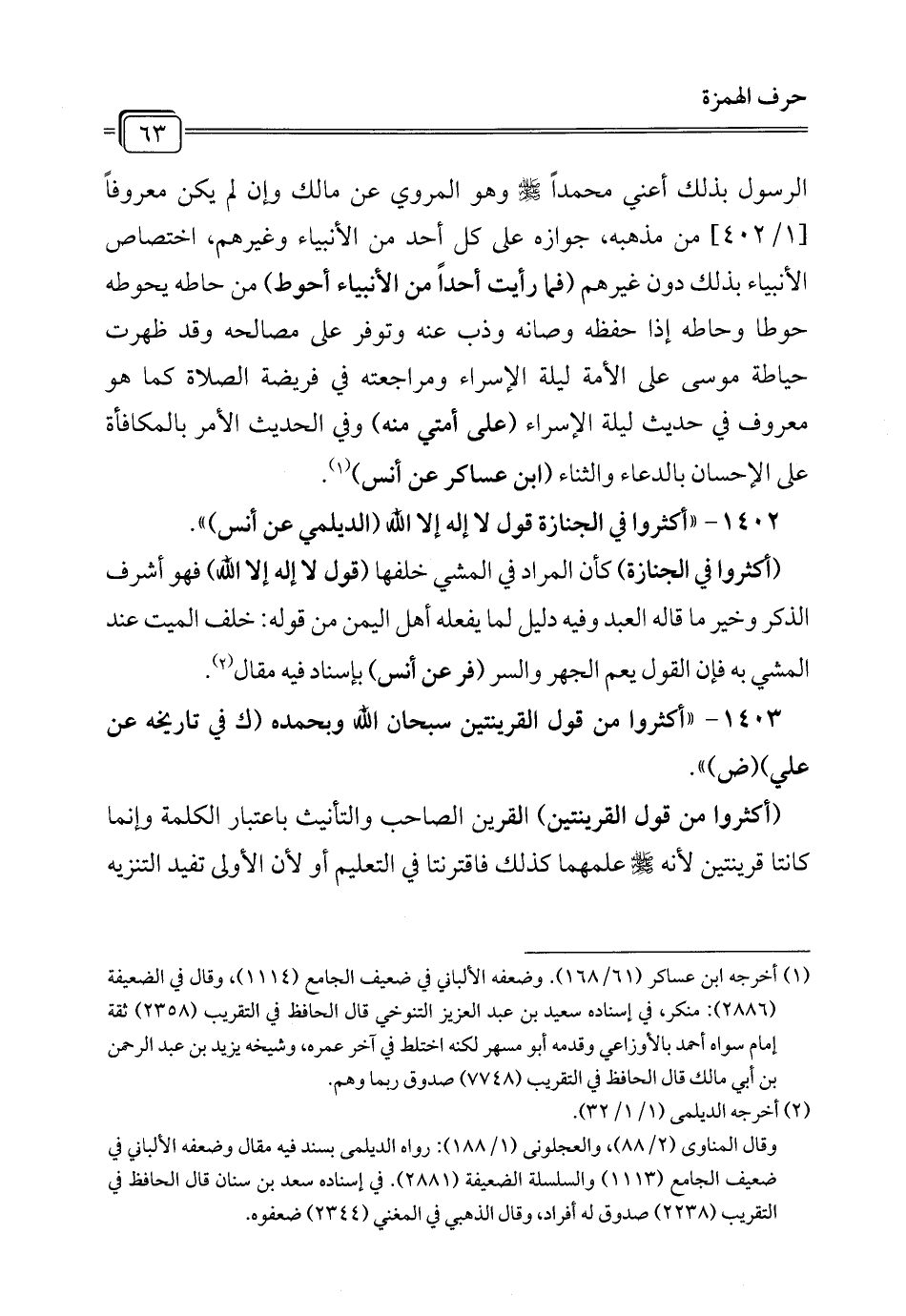 1403 - "أكثروا من قول القرينتين سبحان الله وبحمده (ك في تاريخه عن علي) (ض) ".