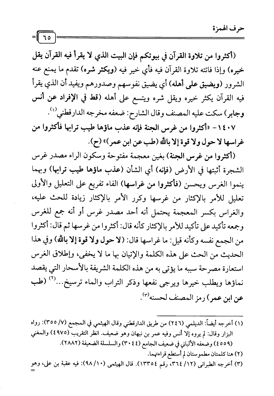 1407 - "أكثروا من غرس الجنة فإنه عذب ماؤها طيب ترابها فأكثروا من غراسها لا حول ولا قوة إلا بالله (طب عن ابن عمر) " (ح).
