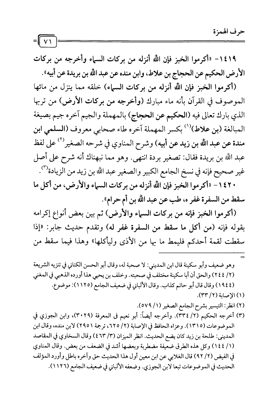 1419 - "أكرموا الخبز فإن الله أنزله من بركات السماء وأخرجه من بركات الأرض الحكيم عن الحجاج بن علاط، وابن منده عن عبد الله ابن بريدة عن أبيه".