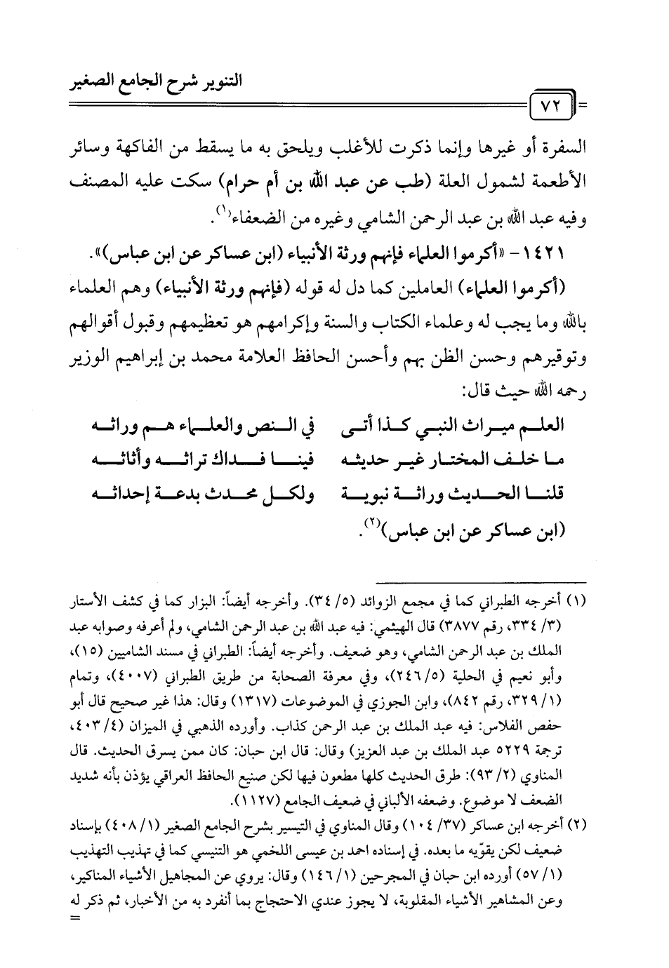 (أكرموا العلماء) العاملين كما دل له قوله (فإنهم ورثة الأنبياء) وهم العلماء بالله وما يجب له وعلماء الكتاب والسنة وإكرامهم هو تعظيمهم وقبول أقوالهم وتوقيرهم وحسن الظن بهم وأحسن الحافظ العلامة محمَّد بن إبراهيم الوزير رحمه الله حيث قال: