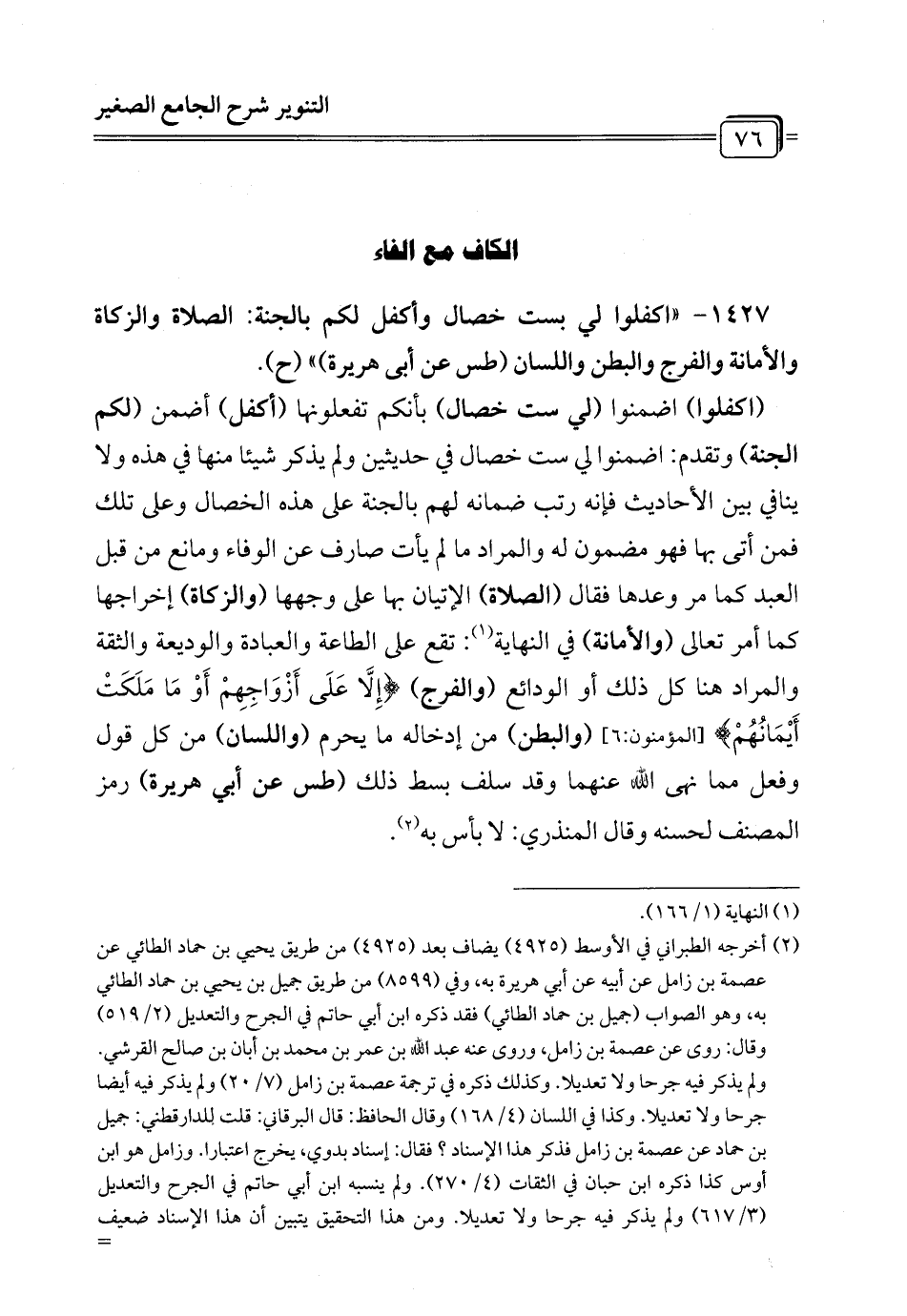 1427 - " اكفلوا لي بست خصال وأكفل لكم بالجنة: الصلاة والزكاة والأمانة والفرج والبطن واللسان (طس عن أبي هريرة) " (ح).