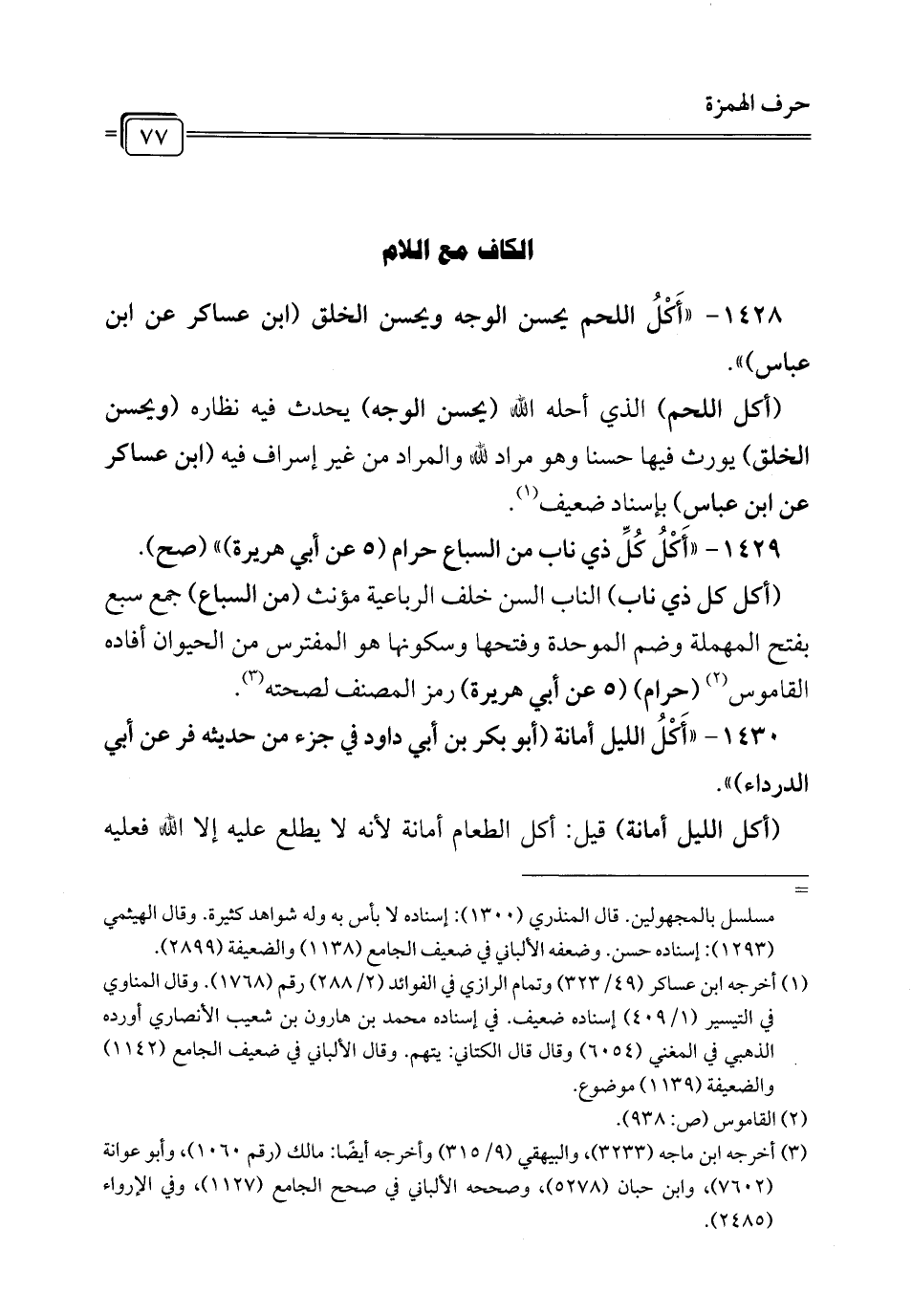 1429 - "أَكْلُ كُلِّ ذي ناب من السباع حرام (5 عن أبي هريرة) " (صح).
