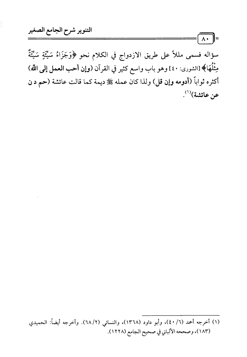 سؤاله فسمى مللًا على طريق الازدواج في الكلام نحو {وَجَزَاءُ سَيِّئَةٍ سَيِّئَةٌ مِثْلُهَا} [الشورى: 40]، وهو باب واسع كثير في القرآن (وإن أحب العمل إلى الله) أكثره ثوابًا (أدومه وإن قل) ولذا كان عمله - صلى الله عليه وسلم - ديمة كما قالت عائشة (حم د ن عن عائشة) (¬1).