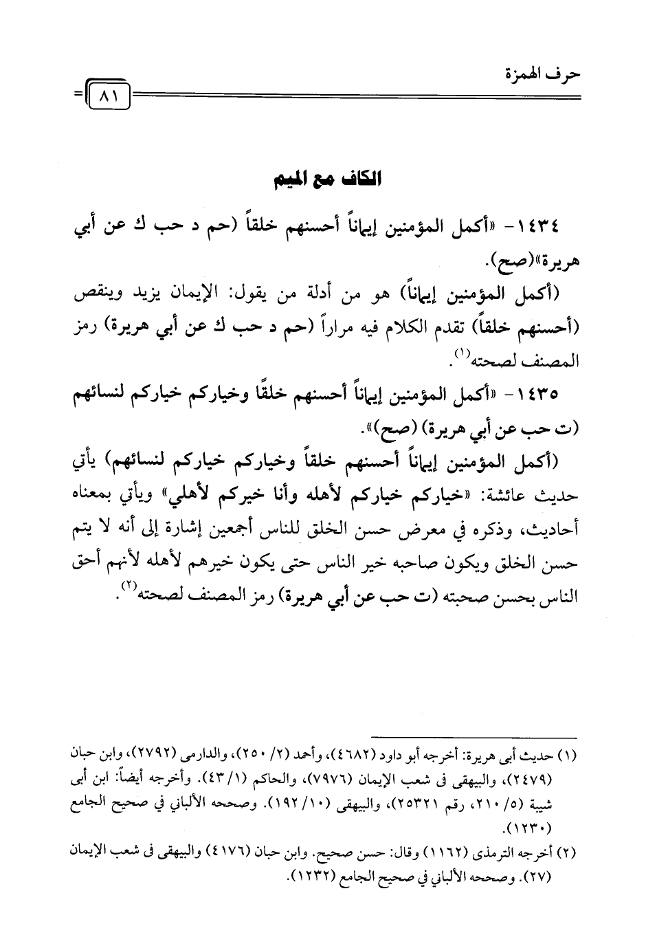 1434 - " أكمل المؤمنين إيمانًا أحسنهم خلقًا (حم د حب ك عن أبي هريرة" (صح).