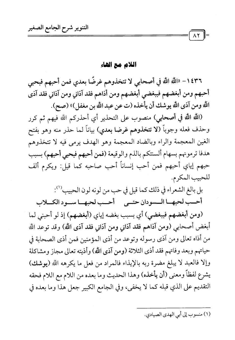 1436 - " الله الله في أصحابي لا تتخذوهم غرضًا بعدي فمن أحبهم فبحبي أحبهم ومن أبغضهم فببغضي أبغضهم ومن أذاهم فقد آذاني ومن آذاني فقد آذى الله ومن آذى الله يوشك أن يأخذه (ت عن عبد الله بن مغفل) " (صح).
