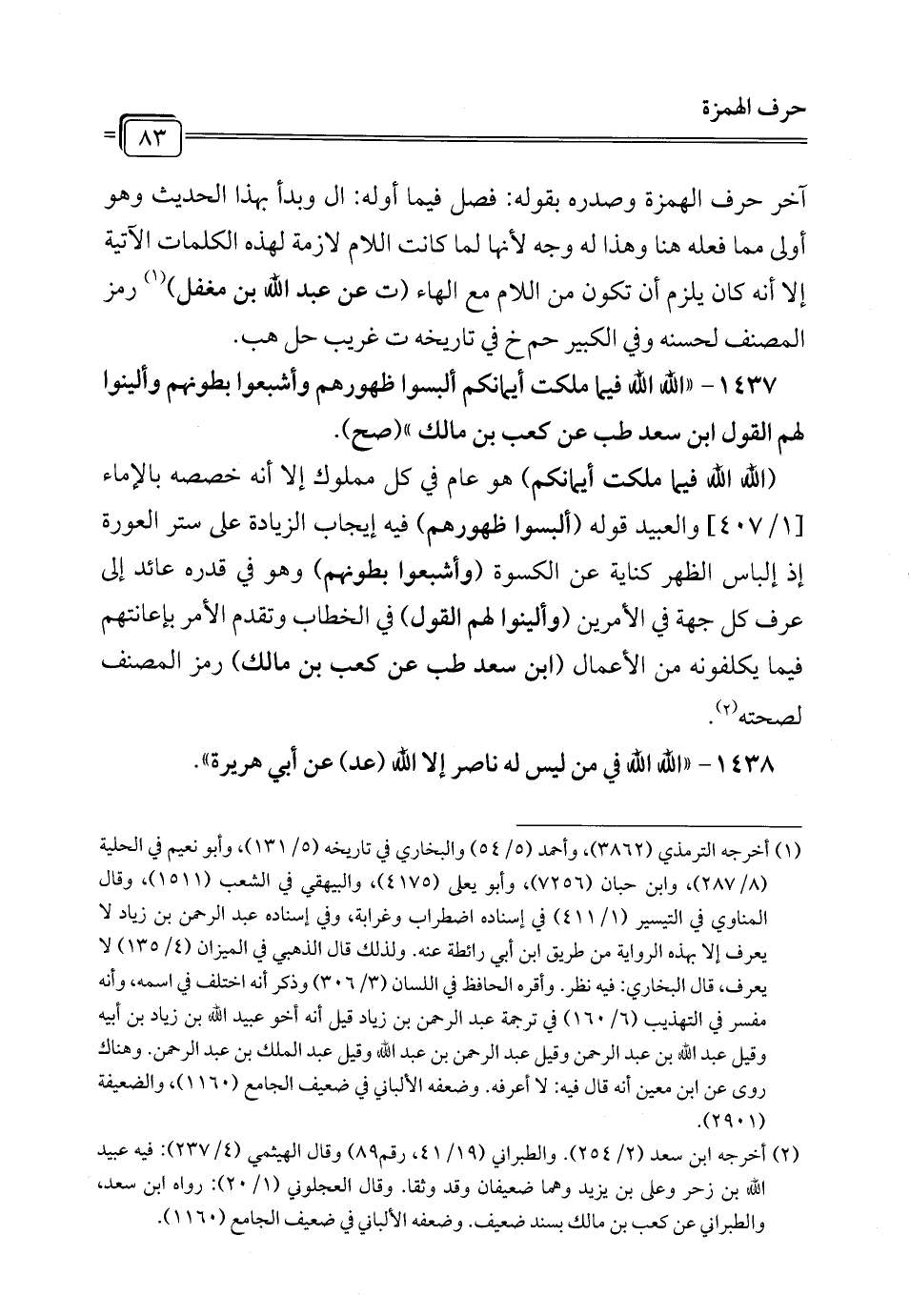 1437 - "الله الله فيما ملكت أيمانكم ألبسوا ظهورهم وأشبعوا بطونهم وألينوا لهم القول ابن سعد طب عن كعب بن مالك" (صح).