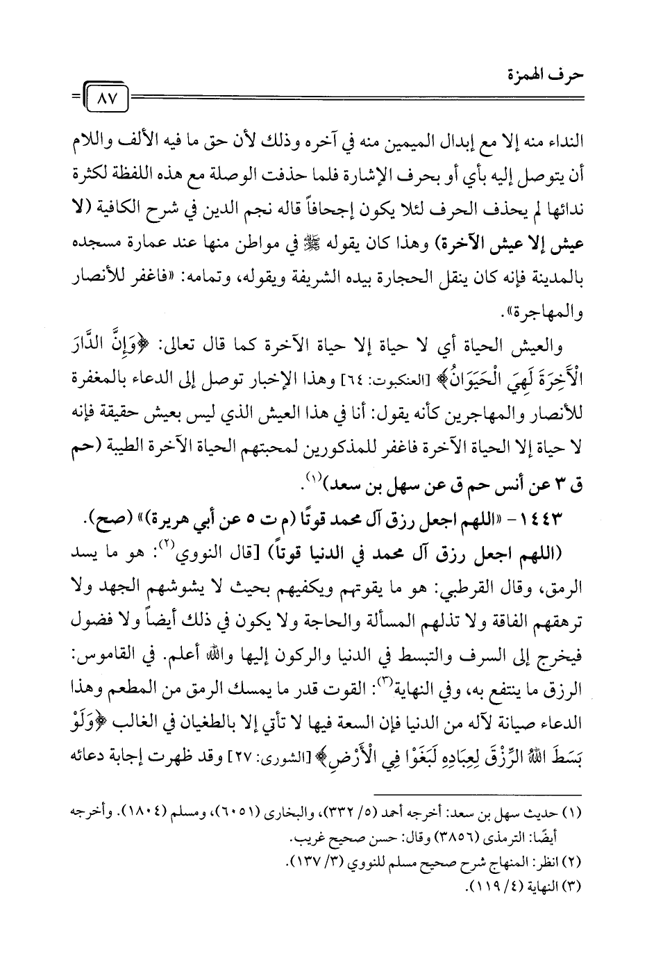 1443 - "اللَّهم اجعل رزق آل محمَّد قوتًا (م ت 5 عن أبي هريرة) " (صح).