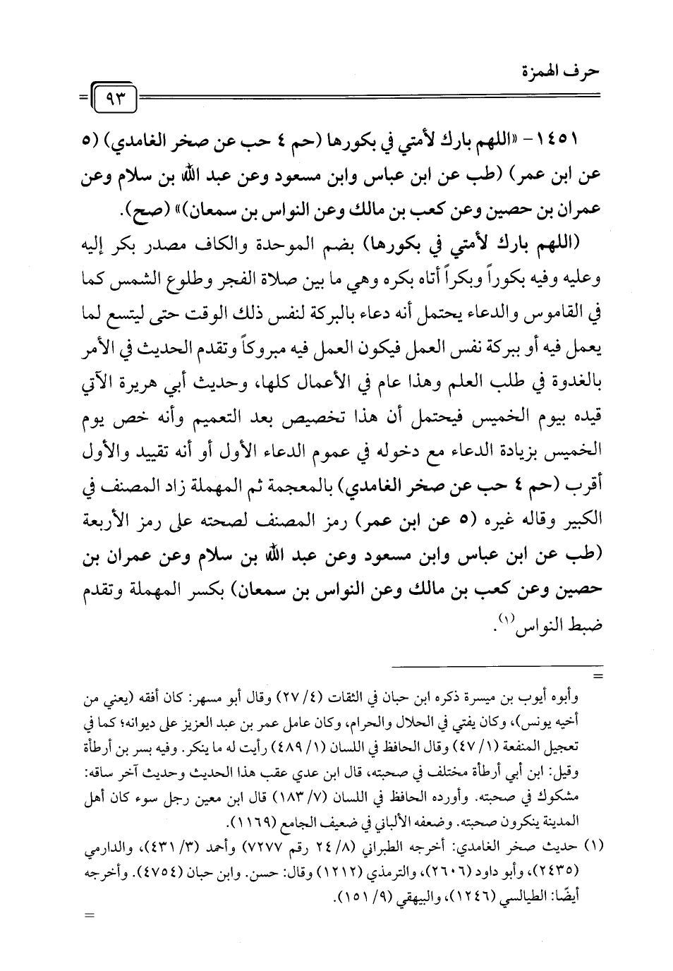 1451 - "اللَّهم بارك لأمتي في بكورها (حم 4 حب عن صخر الغامدي) (5 عن ابن عمر) (طب عن ابن عباس وابن مسعود وعن عبد الله بن سلام وعن عمران بن حصين وعن كعب بن مالك وعن النواس بن سمعان) " (صح).