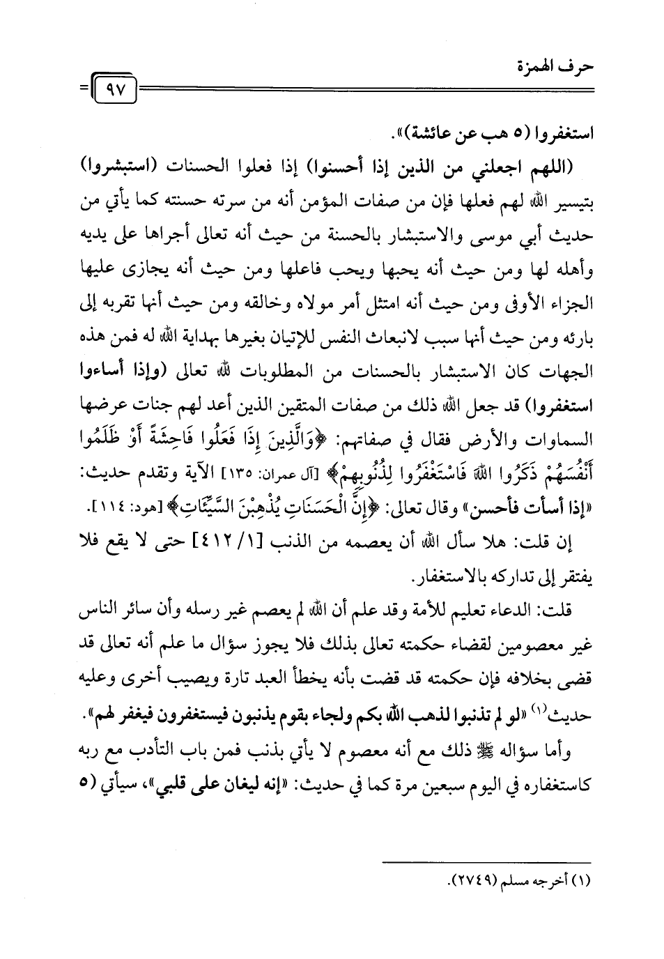 (اللَّهم اجعلني من الذين إذا أحسنوا) إذا فعلوا الحسنات (استبشروا) بتيسير الله لهم فعلها فإن من صفات المؤمن أنه من سرته حسنته كما يأتي من حديث أبي موسى والاستبشار بالحسنة من حيث أنه تعالى أجراها على يديه وأهله لها ومن حيث أنه يحبها ويحب فاعلها ومن حيث أنه يجازى عليها الجزاء الأوفى ومن حيث أنه امتثل أمر مولاه وخالقه ومن حيث أنها تقربه إلى بارئه ومن حيث أنها سبب لانبعاث النفس للإتيان بغيرها بهداية الله له فمن هذه الجهات كان الاستبشار بالحسنات من المطلوبات لله تعالى (وإذا أساءوا استغفروا) قد جعل الله ذلك من صفات المتقين الذين أعد لهم جنات عرضها السماوات والأرض فقال في صفاتهم: {وَالَّذِينَ إِذَا فَعَلُوا فَاحِشَةً أَوْ ظَلَمُوا أَنْفُسَهُمْ ذَكَرُوا اللَّهَ فَاسْتَغْفَرُوا لِذُنُوبِهِمْ} [آل عمران: 135]، الآية وتقدم حديث: "إذا أسأت فأحسن" وقال تعالى: {إِنَّ الْحَسَنَاتِ يُذْهِبْنَ السَّيِّئَاتِ} [هود: 114].