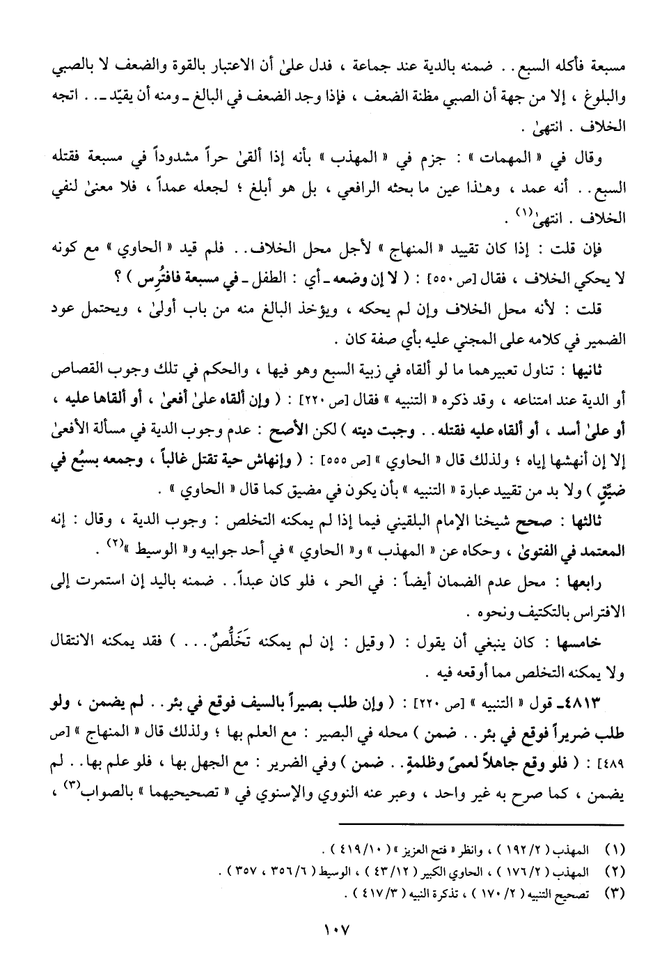 4813 - قول "التنبيه" [ص 220]: (وإن طلب بصيراً بالسيف فوقع في بئر .. لم يضمن، ولو طلب ضريراً فوقع في بئر .. ضمن) محله في البصير: مع العلم بها؛ ولذلك قال "المنهاج" [ص 489]: (فلو وقع جاهلاً لعمىً وظلمةٍ .. ضمن) وفي الضرير: مع الجهل بها، فلو علم بها .. لم يضمن، كما صرح به غير واحد، وعبر عنه النووي والإسنوي في "تصحيحيهما" بالصواب (¬3)،