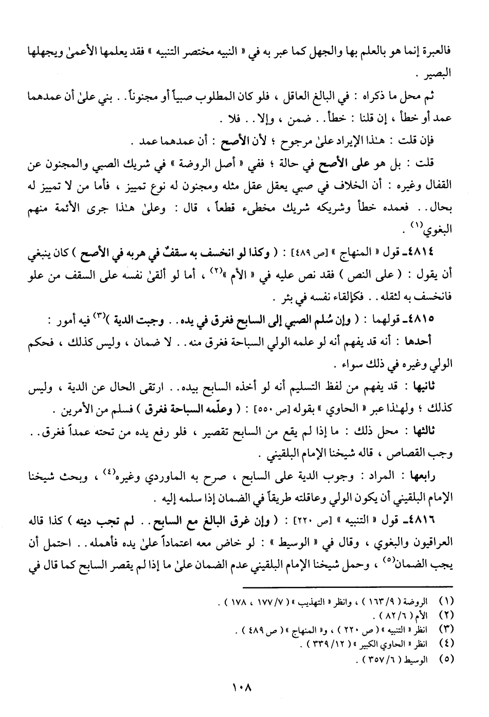 4814 - قول "المنهاج" [ص 489]: (وكذا لو انخسف به سقفٌ في هربه في الأصح) كان ينبغي أن يقول: (على النص) فقد نص عليه في "الأم" (¬2)، أما لو ألقى نفسه على السقف من علو فانخسف به لثقله .. فكإلقاء نفسه في بئر.