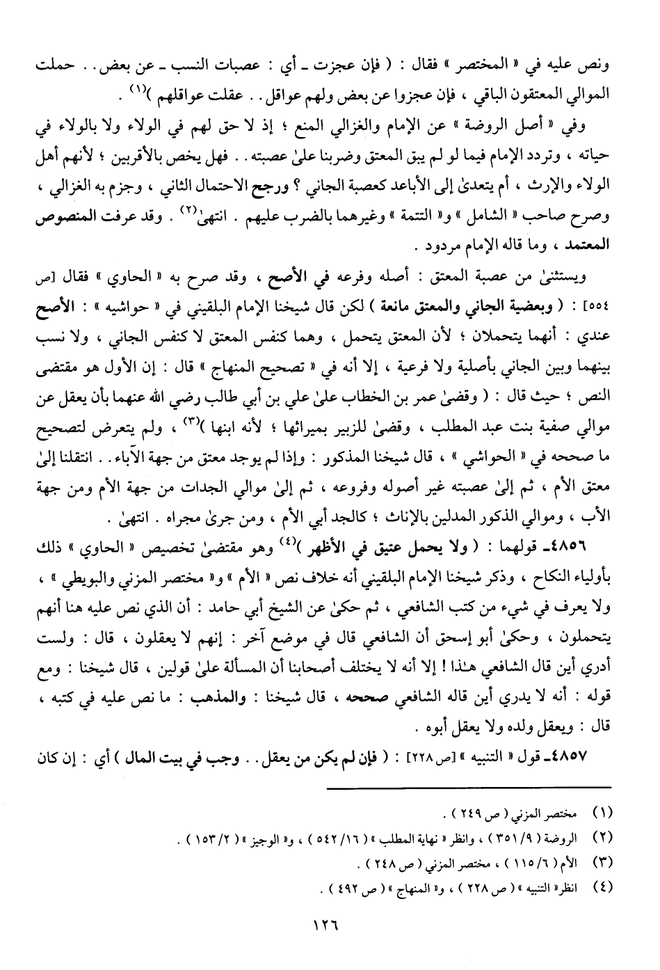 ويستثنى من عصبة المعتق: أصله وفرعه في الأصح، وقد صرح به "الحاوي" فقال [ص 554]: (وبعضية الجاني والمعتق مانعة) لكن قال شيخنا الإمام البلقيني في "حواشيه": الأصح عندي: أنهما يتحملان؛ لأن المعتق يتحمل، وهما كنفس المعتق لا كنفس الجاني، ولا نسب بينهما وبين الجاني بأصلية ولا فرعية، إلا أنه في "تصحيح المنهاج" قال: إن الأول هو مقتضى النص؛ حيث قال: (وقضى عمر بن الخطاب على على بن أبي طالب رضي الله عنهما بأن يعقل عن موالي صفية بنت عبد المطلب، وقضى للزبير بميراثها؛ لأنه ابنها) (¬3)، ولم يتعرض لتصحيح ما صححه في "الحواشي"، قال شيخنا المذكور: وإذا لم يوجد معتق من جهة الآباء .. انتقلنا إلى معتق الأم، ثم إلى عصبته غير أصوله وفروعه، ثم إلى موالي الجدات من جهة الأم ومن جهة الأب، وموالي الذكور المدلين بالإناث؛ كالجد أبي الأم، ومن جرى مجراه. انتهى.