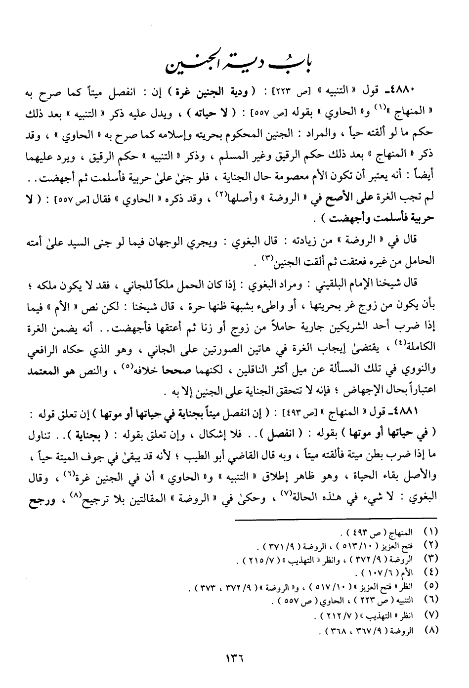 4880 - قول "التنبيه" [ص 223]: (ودية الجنين غرة) إن: انفصل ميتًا كما صرح به "المنهاج" (¬1) و"الحاوي" بقوله [ص 557]: (لا حياته)، ويدل عليه ذكر "التنبيه" بعد ذلك حكم ما لو ألقته حيًا، والمراد: الجنين المحكوم بحريته وإسلامه كما صرح به "الحاوي"، وقد ذكر "المنهاج" بعد ذلك حكم الرقيق وغير المسلم، وذكر "التنبيه" حكم الرقيق، ويرد عليهما أيضًا: أنه يعتبر أن تكون الأم معصومة حال الجناية، فلو جني على حربية فأسلمت ثم أجهضت .. لم تجب الغرة على الأصح في "الروضة" وأصلها (¬2)، وقد ذكره "الحاوي" فقال [ص 557]: (لا حربية فأسلمت وأجهضت).