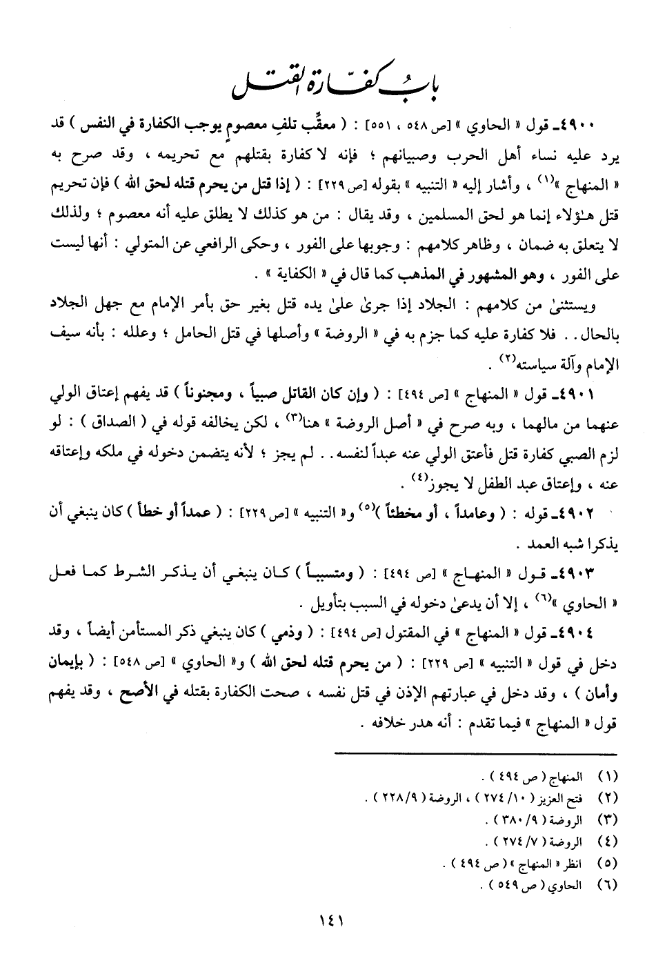 4900 - قول "الحاوي" [ص 548، 551]: (معقِّب تلفِ معصومٍ يوجب الكفارة في النفس) قد يرد عليه نساء أهل الحرب وصبيانهم؛ فإنه لا كفارة بقتلهم مع تحريمه، وقد صرح به "المنهاج" (¬1)، وأشار إليه "التنبيه" بقوله [ص 229]: (إذا قتل من يحرم قتله لحق الله) فإن تحريم قتل هؤلاء إنما هو لحق المسلمين، وقد يقال: من هو كذلك لا يطلق عليه أنه معصوم؛ ولذلك لا يتعلق به ضمان، وظاهر كلامهم: وجوبها على الفور، وحكي الرافعي عن المتولي: أنها ليست على الفور، وهو المشهور في المذهب كما قال في "الكفاية".
