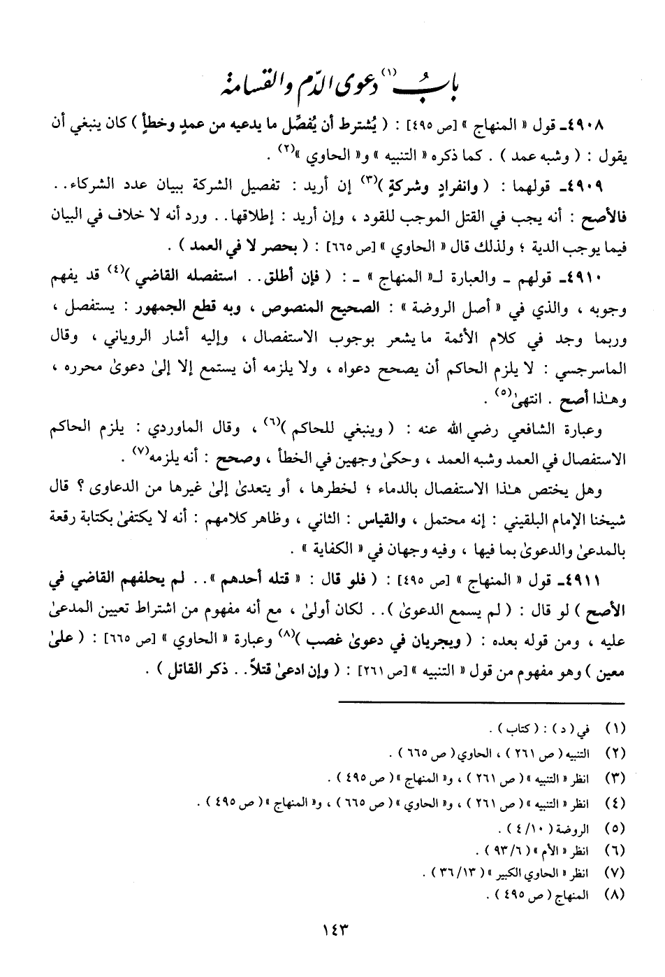 4908 - قول "المنهاج" [ص 495]: (يُشترط أن يُفصِّل ما يدعيه من عمدٍ وخطأٍ) كان ينبغي أن يقول: (وشبه عمد). كما ذكره "التنبيه" و"الحاوي" (¬2).