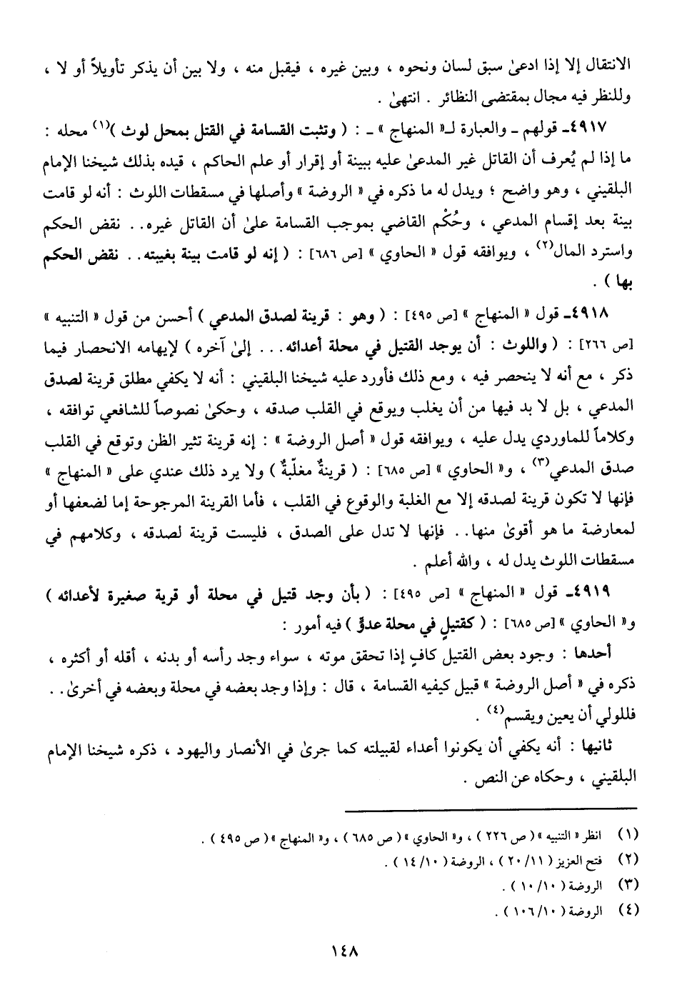4919 - قول "المنهاج" [ص 495]: (بأن وجد قتيل في محلة أو قرية صغيرة لأعدائه) و"الحاوي" [ص 685]: (كقتيل في محلة عدو) فيه أمور: