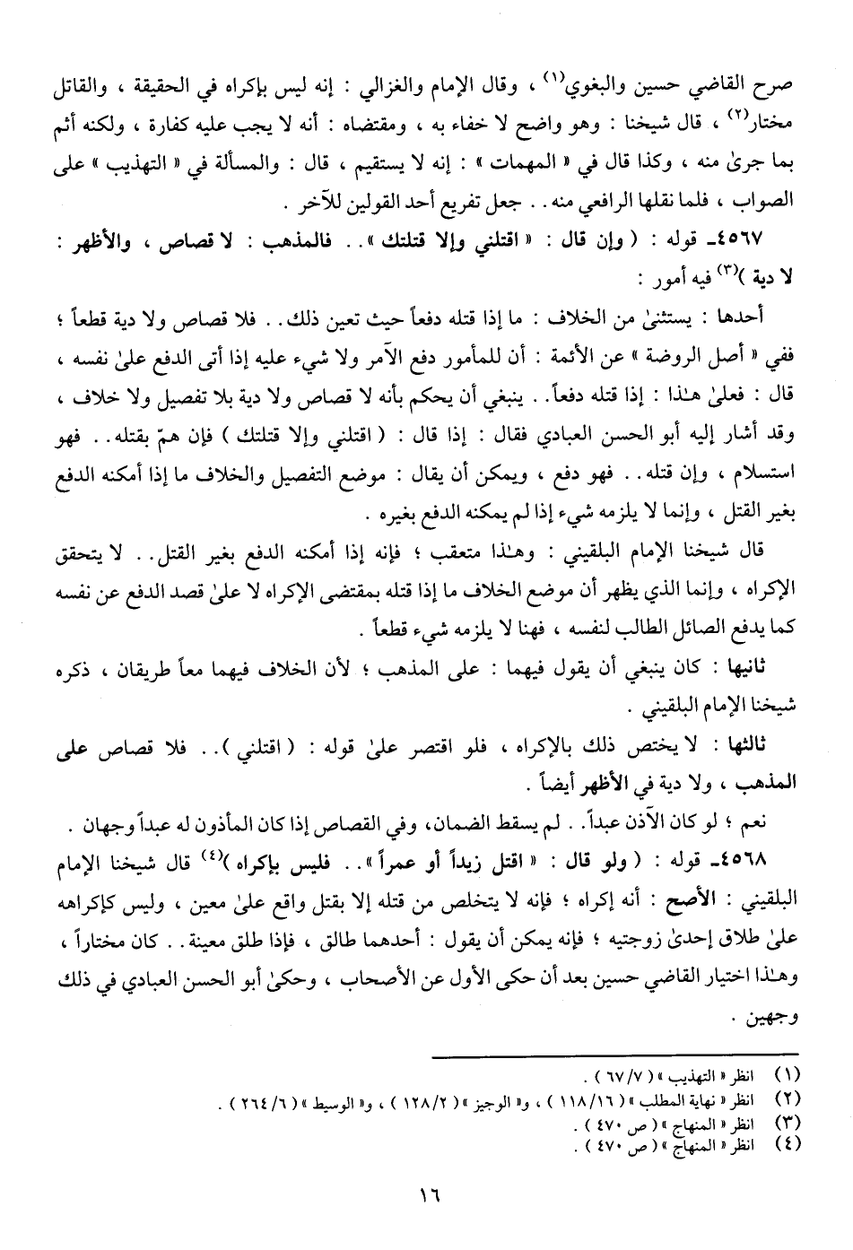 قال شيخنا الإمام البلقيني: وهذا متعقب؛ فإنه إذا أمكنه الدفع بغير القتل .. لا يتحقق الإكراه، وإنما الذي يظهر أن موضع الخلاف ما إذا قتله بمقتضى الإكراه لا على قصد الدفع عن نفسه كما يدفع الصائل الطالب لنفسه، فهنا لا يلزمه شيء قطعا.