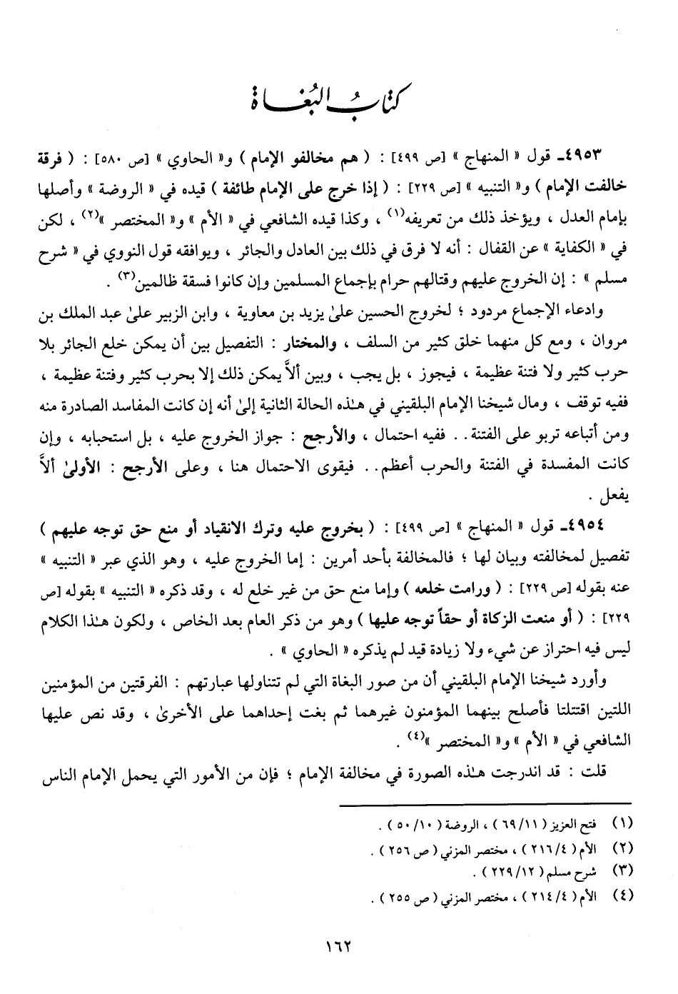 4954 - قول "المنهاج" [ص 499]: (بخروج عليه وترك الانقياد أو منع حق توجه عليهم) تفصيل لمخالفته وبيان لها، فالمخالفة بأحد أمرين: إما الخروج عليه، وهو الذي عبر "التنبيه" عنه بقوله [ص 229]: (ورامت خلعه) وإما منع حق من غير خلع له، وقد ذكره "التنبيه" بقوله [ص 229]: (أو منعت الزكاة أو حقًا توجه عليها) وهو من ذكر العام بعد الخاص، ولكون هذا الكلام ليس فيه احتراز عن شيء ولا زيادة قيد لم يذكره "الحاوي".