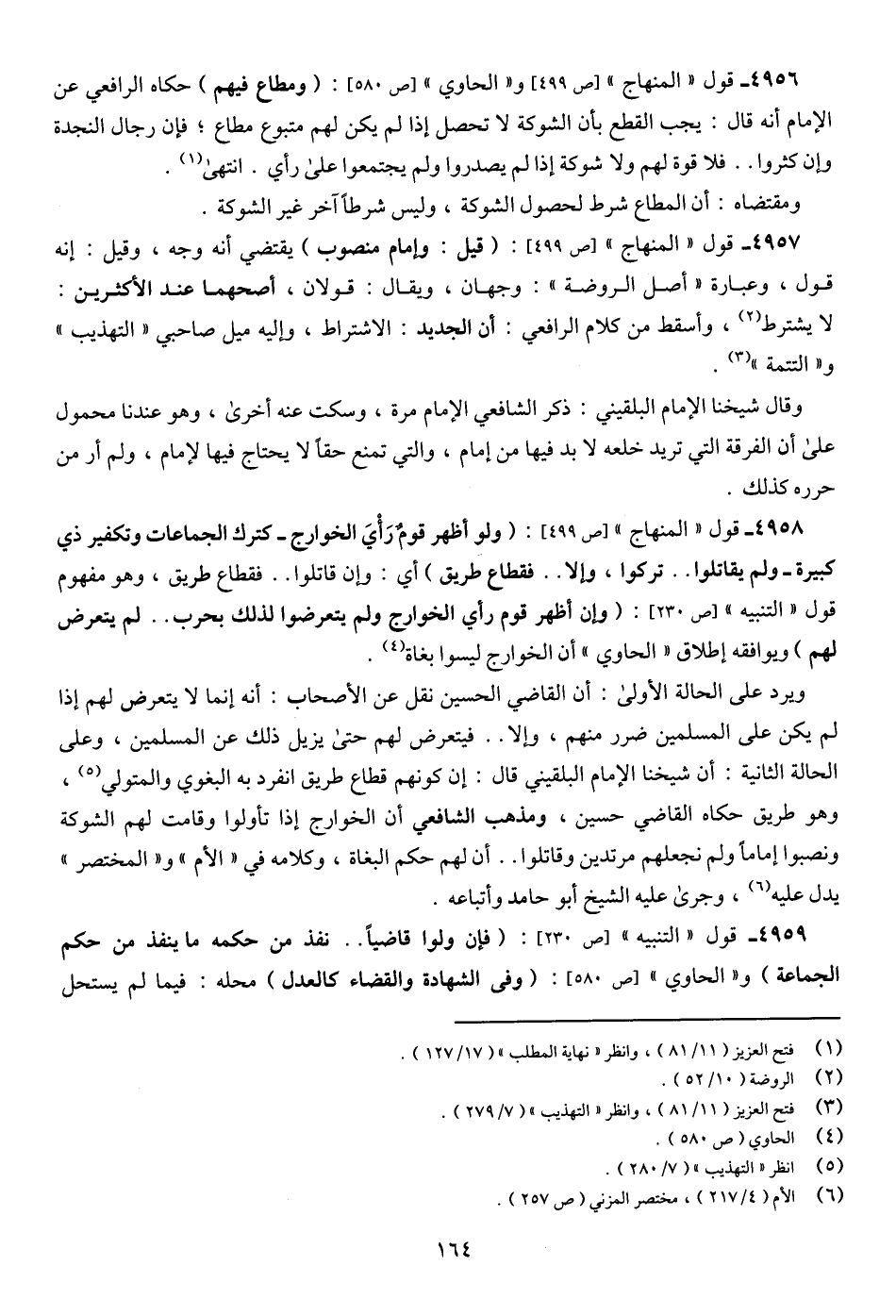 4956 - قول "المنهاج" [ص 499] و"الحاوي" [ص 580]: (ومطاع فيهم) حكاه الرافعي عن الإمام أنه قال: يجب القطع بأن الشوكة لا تحصل إذا لم يكن لهم متبوع مطاع؛ فإن رجال النجدة وإن كثروا .. فلا قوة لهم ولا شوكة إذا لم يصدروا ولم يجتمعوا على رأي. انتهى (¬1).