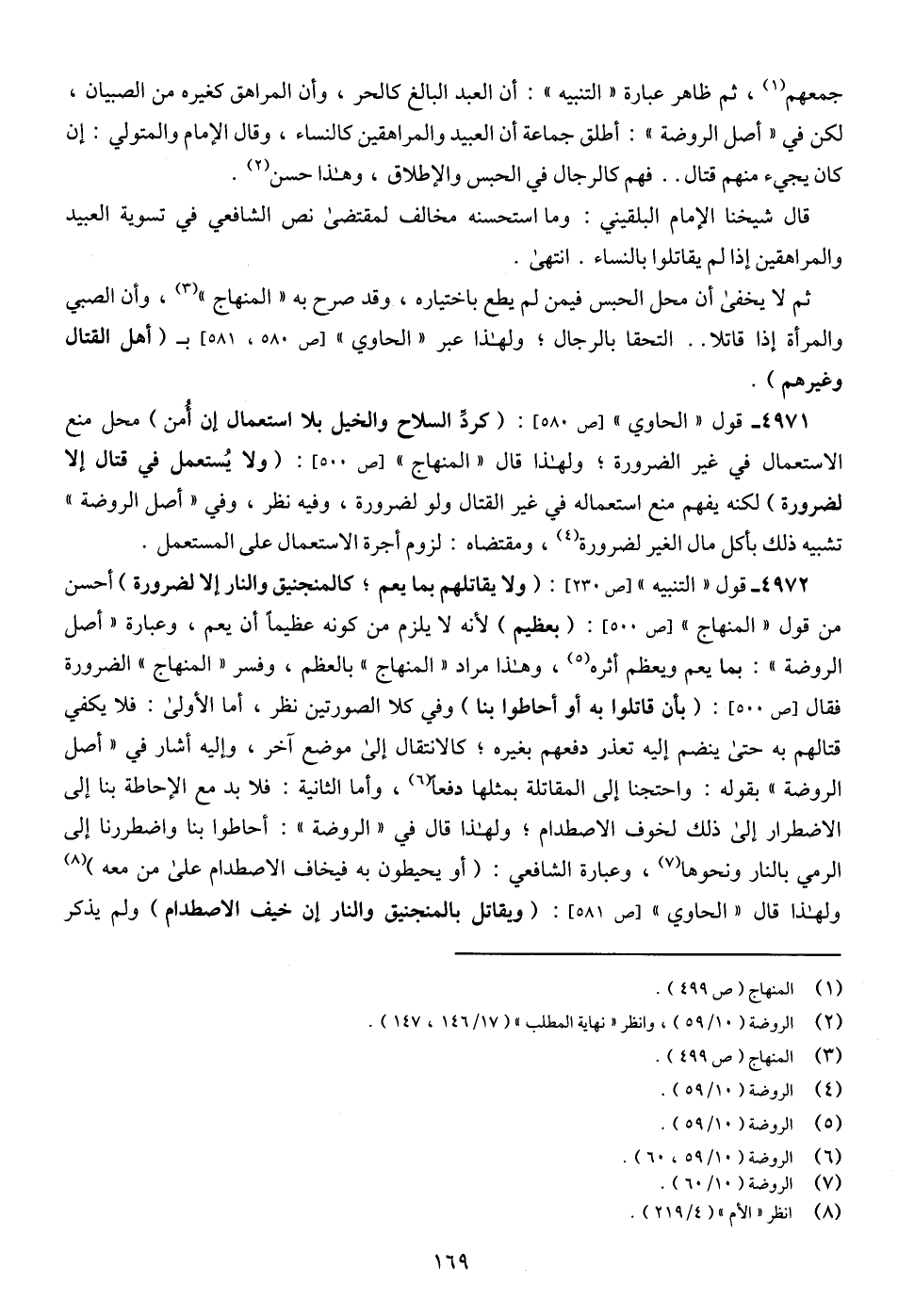 4972 - قول "التنبيه" [ص 230]: (ولا يقاتلهم بما يعم؛ كالمنجنيق والنار إلا لضرورة) أحسن من قول "المنهاج" [ص 500]: (بعظيم) لأنه لا يلزم من كونه عظيمًا أن يعم، وعبارة "أصل الروضة": بما يعم ويعظم أثره (¬5)، وهذا مراد "المنهاج" بالعظم، وفسر "المنهاج" الضرورة فقال [ص 500]: (بأن قاتلوا به أو أحاطوا بنا) وفي كلا الصورتين انظر، أما الأولى: فلا يكفي قتالهم به حتى ينضم إليه تعذر دفعهم بغيره؛ كالانتقال إلى موضع آخر، وإليه أشار في "أصل الروضة" بقوله: واحتجنا إلى المقاتلة بمثلها دفعًا (¬6)، وأما الثانية: فلا بد مع الإحاطة بنا إلى الاضطرار إلى ذلك لخوف الاصطدام؛ ولهذا قال في "الروضة": أحاطوا بنا واضطررنا إلى الرمي بالنار ونحوها (¬7)، وعبارة الشافعي: (أو يحيطون به فيخاف الاصطدام على من معه) (¬8) ولهذا قال "الحاوي" [ص 581]: (ويقاتل بالمنجنيق والنار إن خيف الاصطدام) ولم يذكر