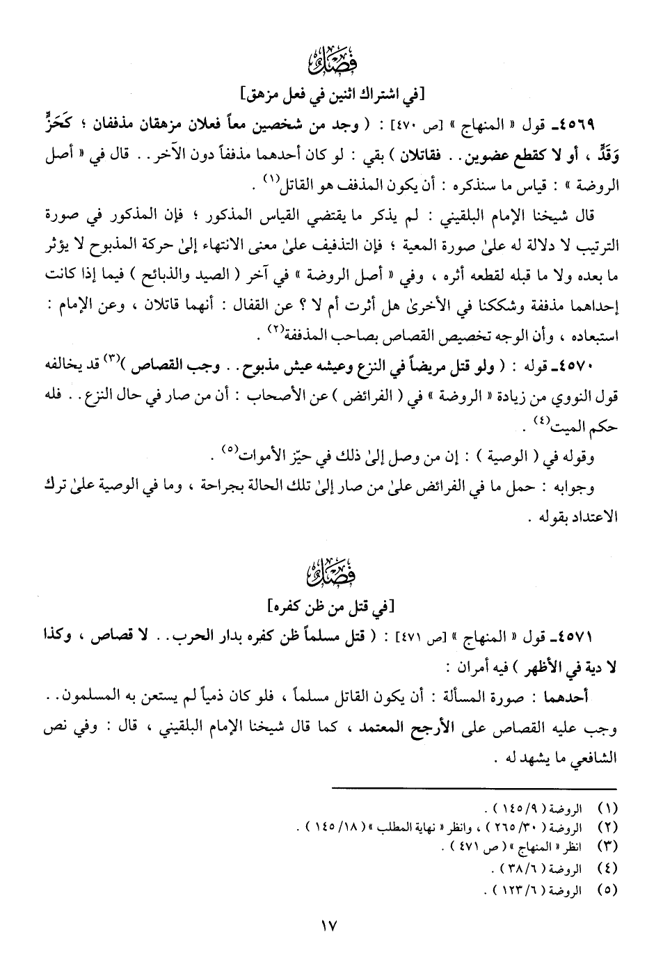 4569 - قول "المنهاج" [ص 470]: (وجد من شخصين معاً فعلان مزهقان مذففان؛ كَحَزٍّ وَقَدٍّ، أو لا كقطع عضوين .. فقاتلان) بقي: لو كان أحدهما مذففاً دون الآخر .. قال في "أصل الروضة": قياس ما سنذكره: أن يكون المذفف هو القاتل (¬1).