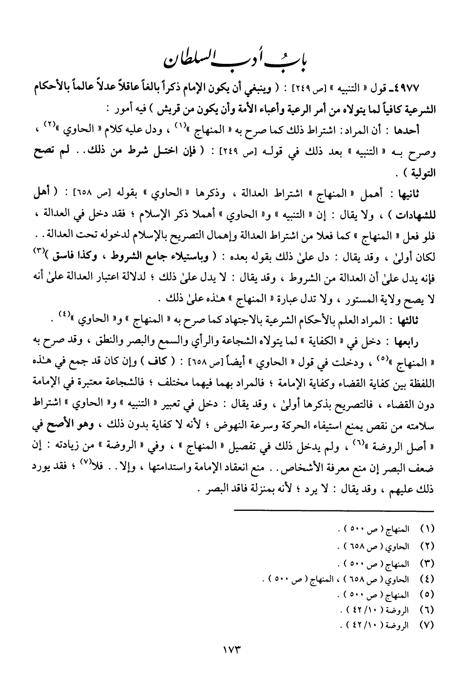 4977 - قول "التنبيه" [ص 249]: (وينبغي أن يكون الإمام ذكرًا بالغًا عاقلًا عدلًا عالمًا بالأحكام الشرعية كافيًا كما يتولاه من أمر الرعية وأعباء الأمة وأن يكون من قريش) فيه أمور: