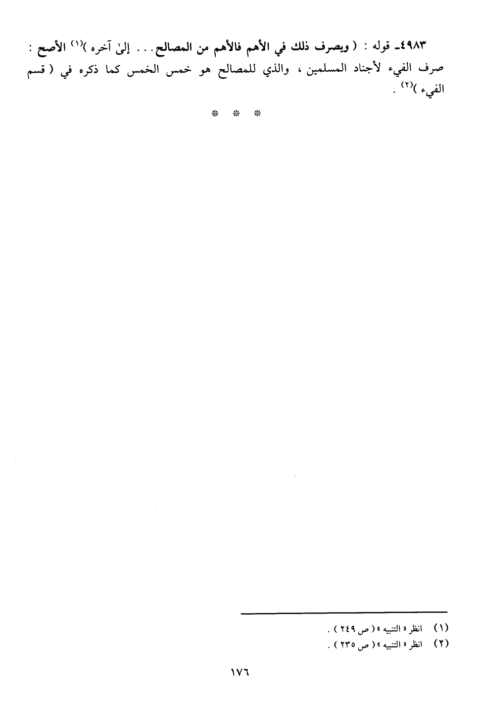 4983 - قوله: (ويصرف ذلك في الأهم فالأهم من المصالح ... إلى آخره) (¬1) الأصح: صرف الفيء لأجناد المسلمين، والذي للمصالح هو خمس الخمس كما ذكره في (قسم الفيء) (¬2).