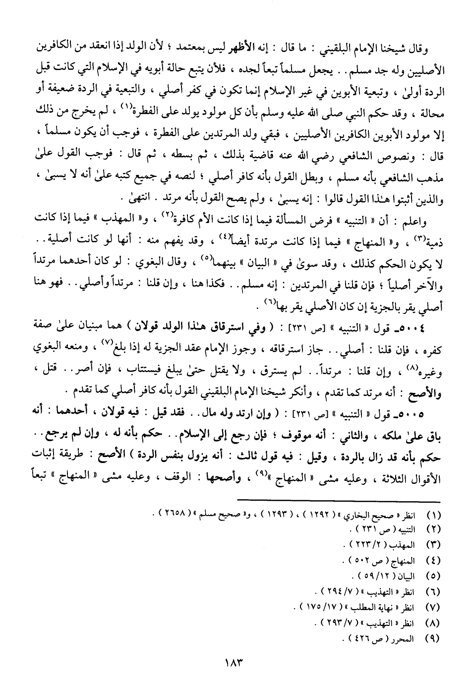 5054 - قول "التنبيه" [ص 231]: (وفي استرقاق هذا الولد قولان) هما مبنيان على صفة كفره، فإن قلنا: أصلي .. جاز استرقاقه، وجوز الإمام عقد الجِزيَةَ له إذا بلغ (¬7)، ومنعه البغوي وغيره (¬8)، وإن قلنا: مرتدًا .. لم يسترق، ولا يقتل حتَّى يبلغ فيستتاب، فإن أصر .. قتل، والأصح: أنَّه مرتد كما تقدم، وأنكر شيخنا الإمام البلقيني القول بأنه كافر أصلي كما تقدم.